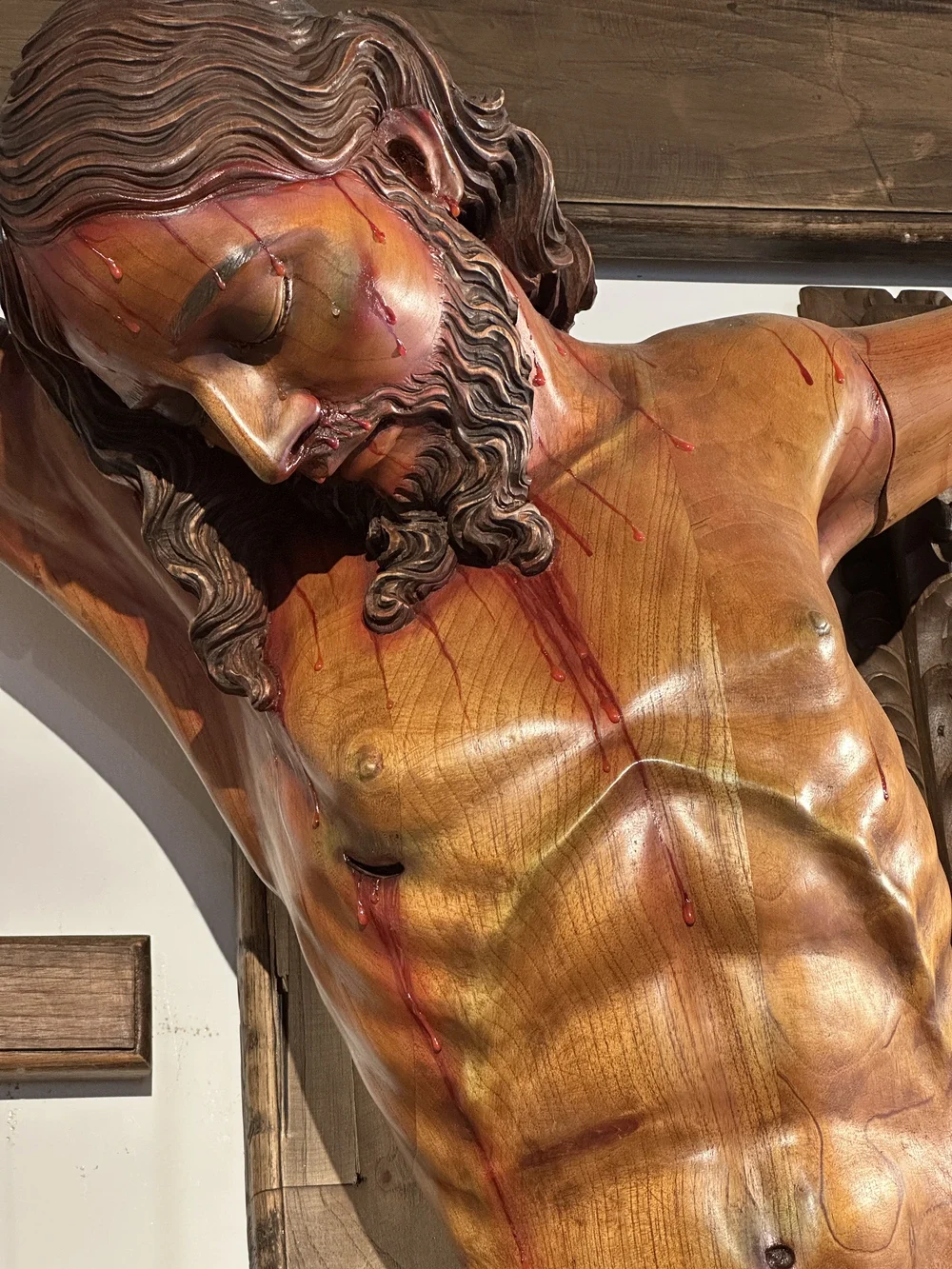El Santísimo Cristo Crucificado es la imagen central del cristianismo, que conmemora el supremo sacrificio de Jesús en la Cruz para la redención de la humanidad. Esta representación monumental enfatiza el dolor, el realismo anatómico y la emoción dramática propia del arte barroco, destacando aquí la nobleza intrínseca de la madera natural como reflejo de la esencia eterna del sacrificio.