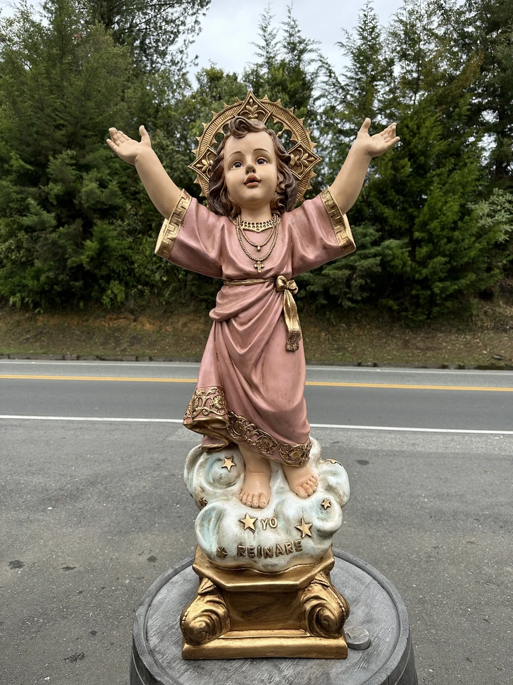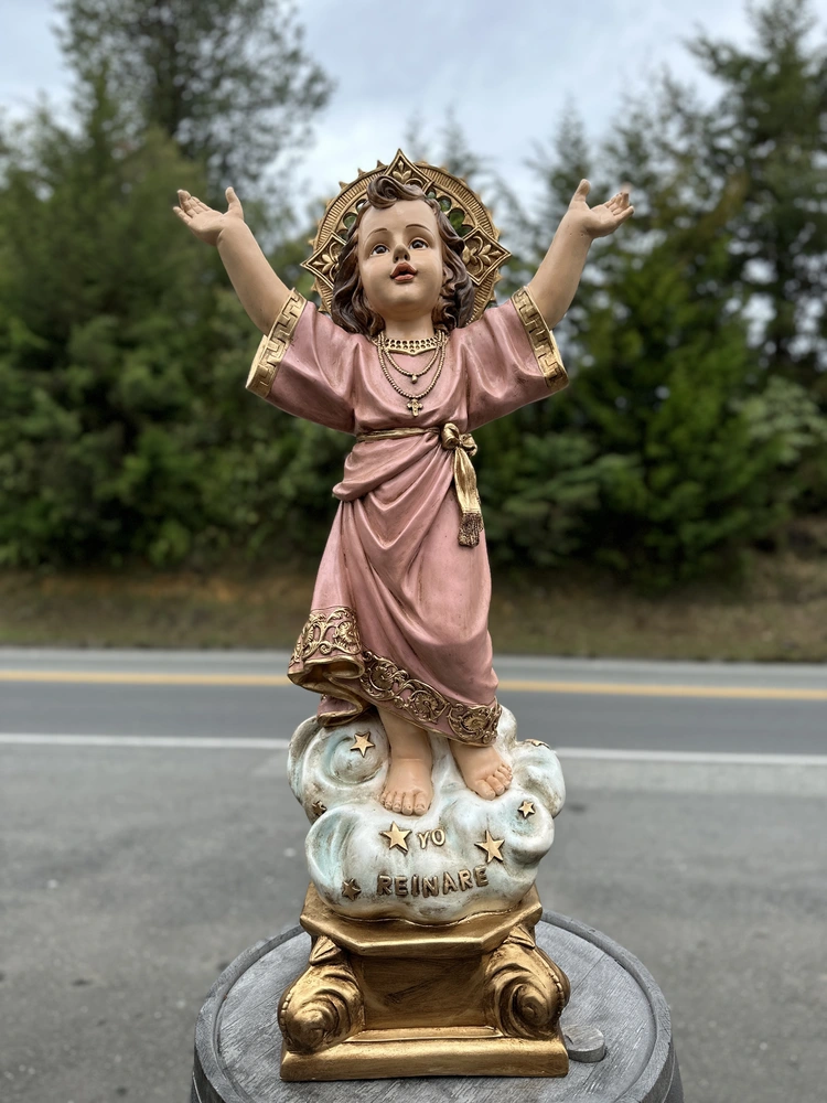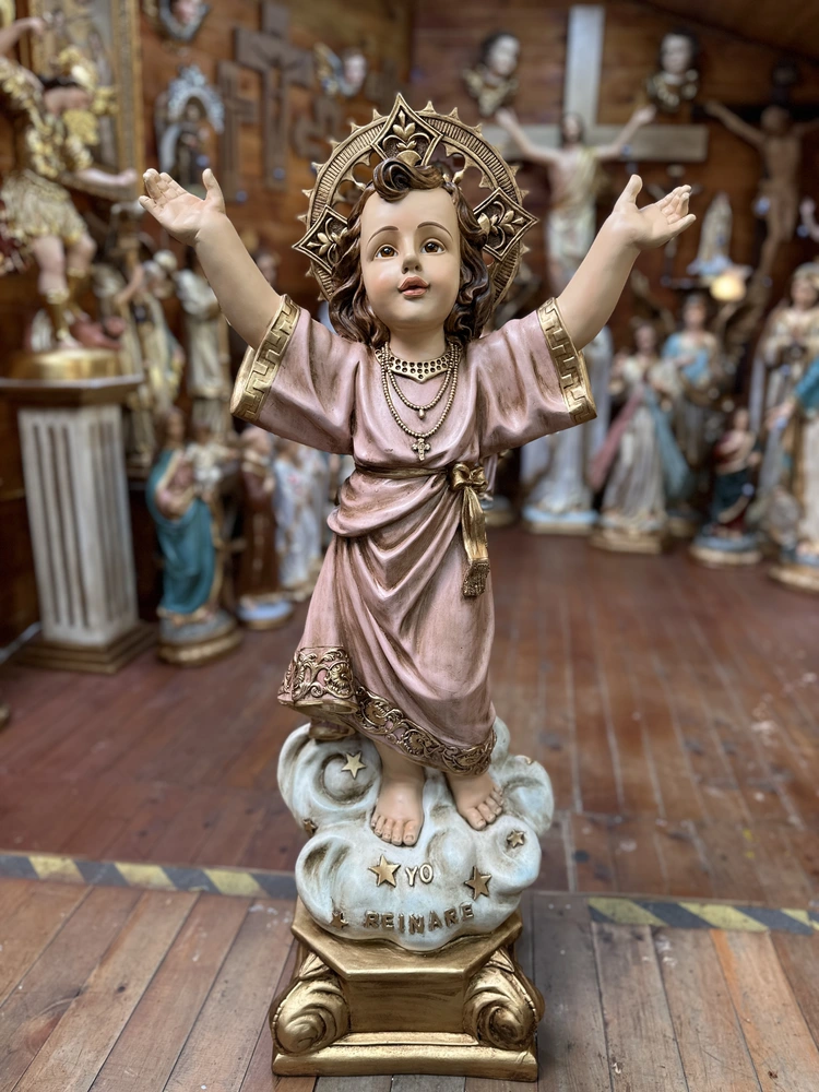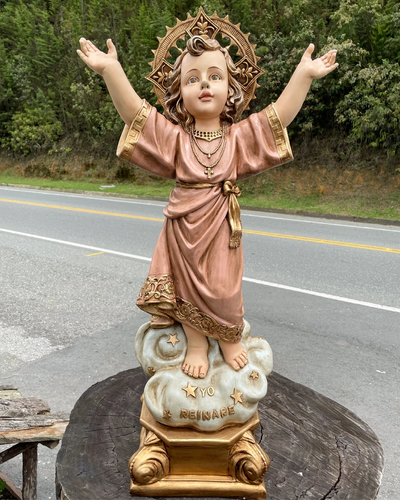El Divino Niño Jesús, es la advocación de origen colombiano que celebra la infancia y la divinidad de Cristo. Esta tierna pieza de 100 cm de altura, elaborada en fibra de vidrio de alta resistencia, reproduce la figura del Niño de pie, con Sus brazos abiertos en gesto de bienvenida universal. Con colores alegres y un acabado de dulzura y sencillez, la escultura irradia inocencia y poder. Es el símbolo visible de la confianza ilimitada que debemos depositar en la infancia de Cristo y la promesa de Su reinado: «Yo reinaré».