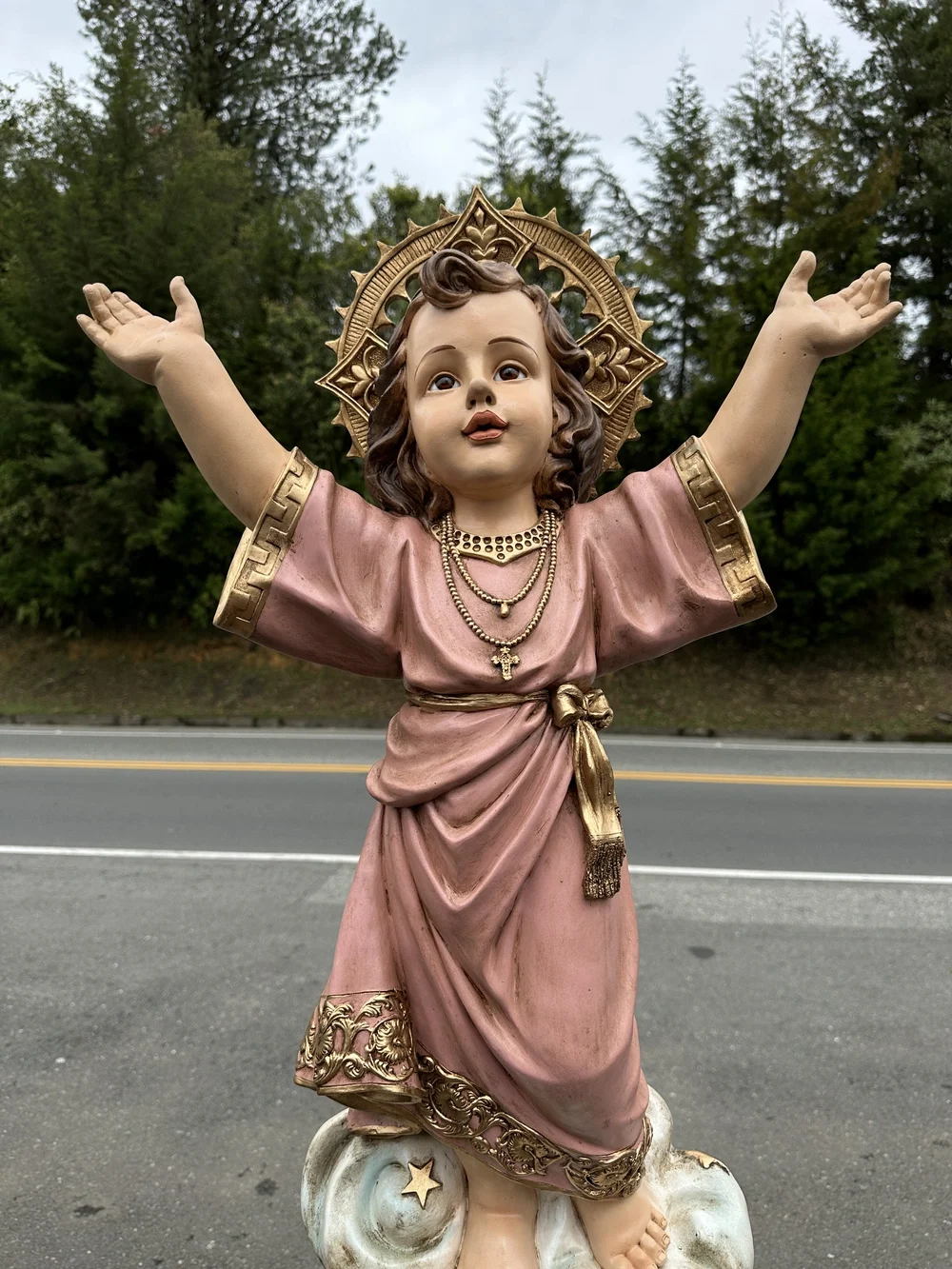 La iconografía del Divino Niño es un poderoso recordatorio de que la divinidad se encuentra en la sencillez. La figura de un Niño de pie con los brazos extendidos con expresión sonriente y madura subraya Su majestad, Su amor universal, Su acogida incondicional y Su disposición a bendecir a todos Sus hijos sin distinción. La túnica de color rosa evoca Su humanidad y, al mismo tiempo, el sacrificio de amor que le espera. La pequeña cruz cerca de Él prefigura Su misión redentora, indicando que Su infancia está intrínsecamente ligada a Su Pasión.