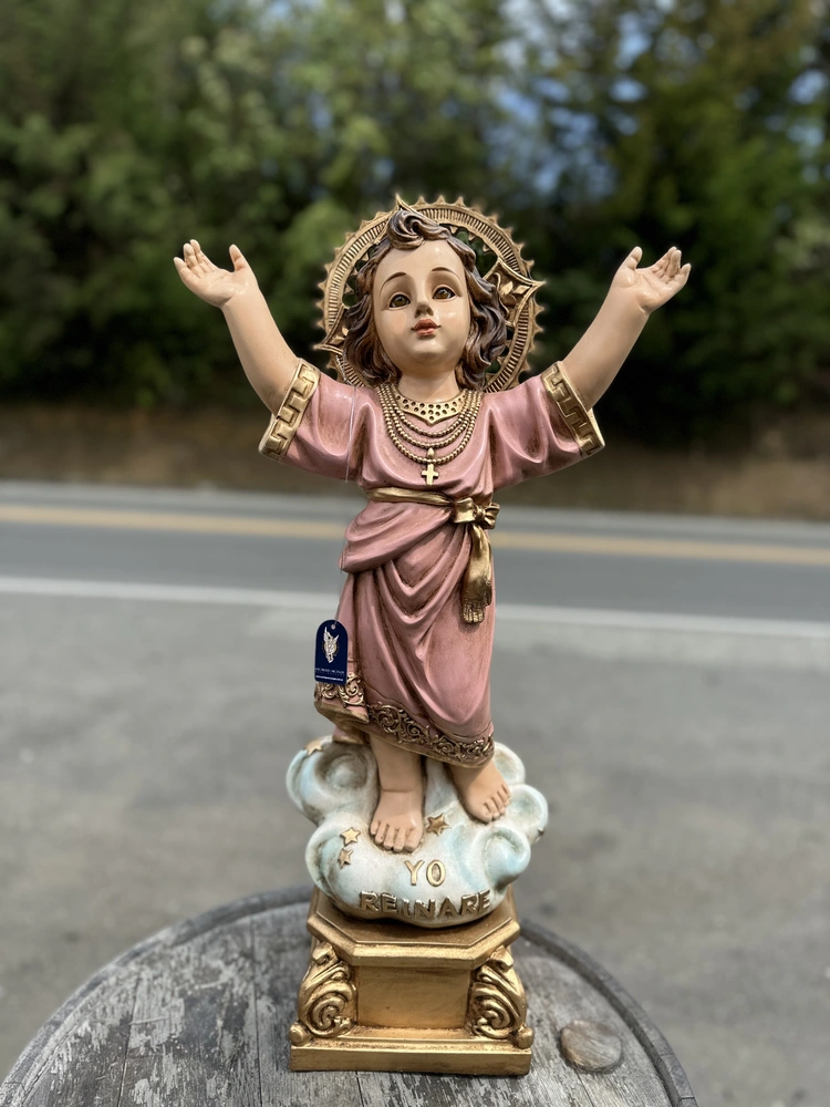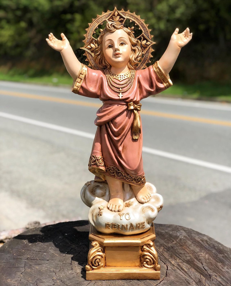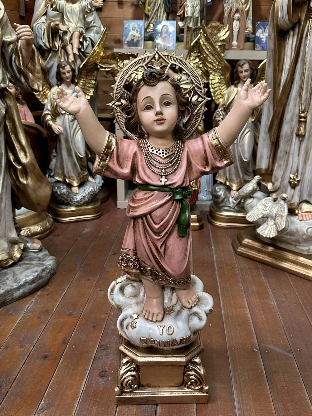 El Divino Niño Jesús, es la advocación de origen colombiano que celebra la infancia y la divinidad de Cristo. Esta tierna pieza de 70 cm de altura, elaborada en fibra de vidrio de alta resistencia, reproduce la figura del Niño de pie, con Sus brazos abiertos en gesto de bienvenida universal. Con colores alegres y un acabado de dulzura y sencillez, la escultura irradia inocencia y poder. Es el símbolo visible de la confianza ilimitada que debemos depositar en la infancia de Cristo y la promesa de Su reinado: «Yo reinaré».