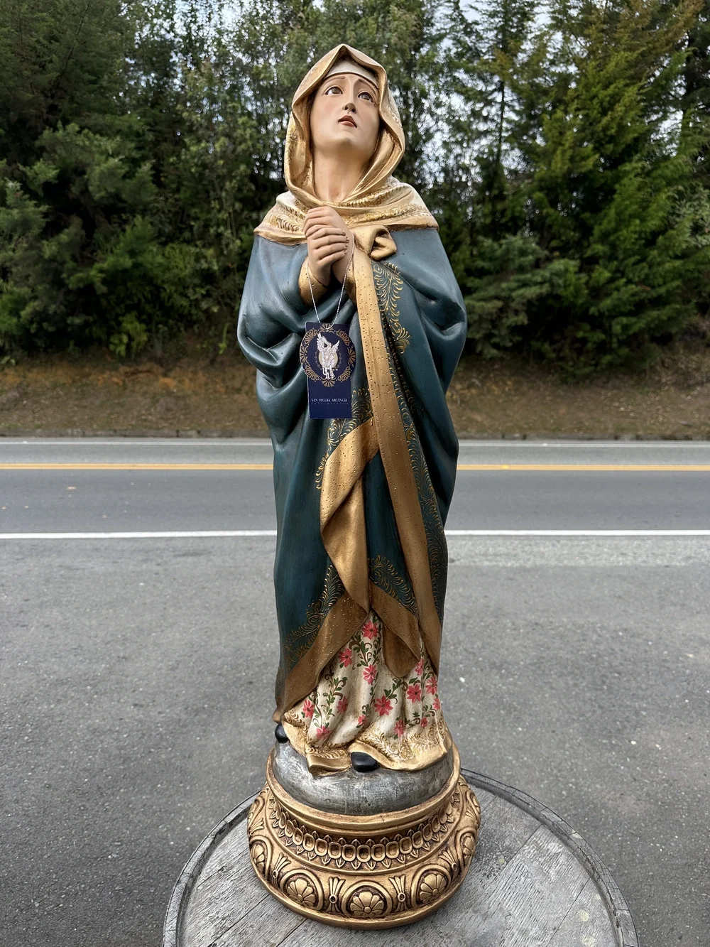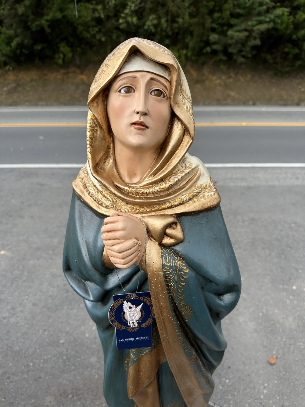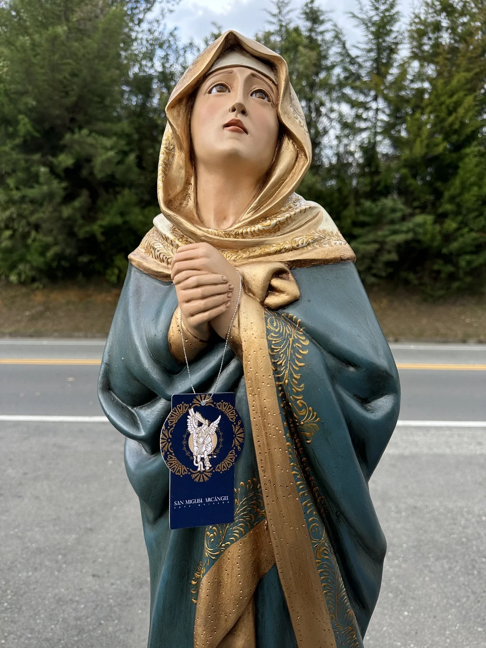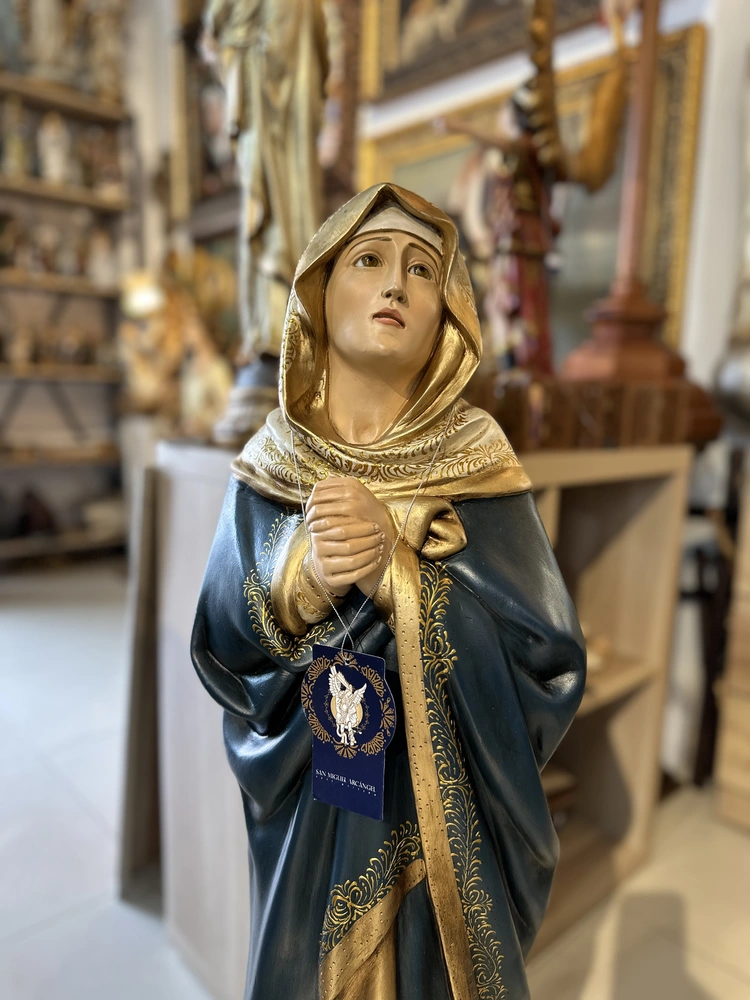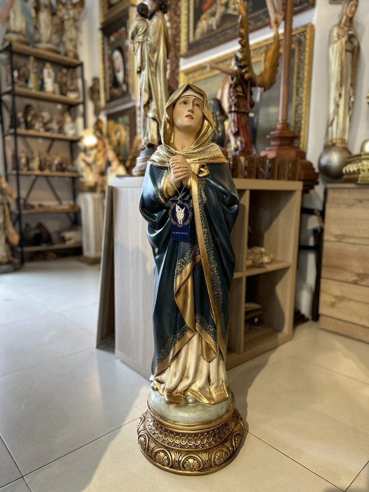 Nuestra Señora Dolorosa, conocida como la Virgen de los Dolores, es la Madre que acompaña a su Hijo en Su Pasión y Muerte. Esta conmovedora imagen de 100 cm, elaborada en fibra de vidrio de alta calidad, destaca por sus delicados detalles y la profunda expresión de su rostro. El diseño presenta un acabado con tonos oscuros y solemnes, fiel a la iconografía de la Pasión: el manto azul oscuro o negro que simboliza el luto, la tristeza y el sufrimiento. Esta paleta de colores confiere a la pieza una solemnidad atemporal y profunda, haciendo de ella un tesoro de fe y empatía.