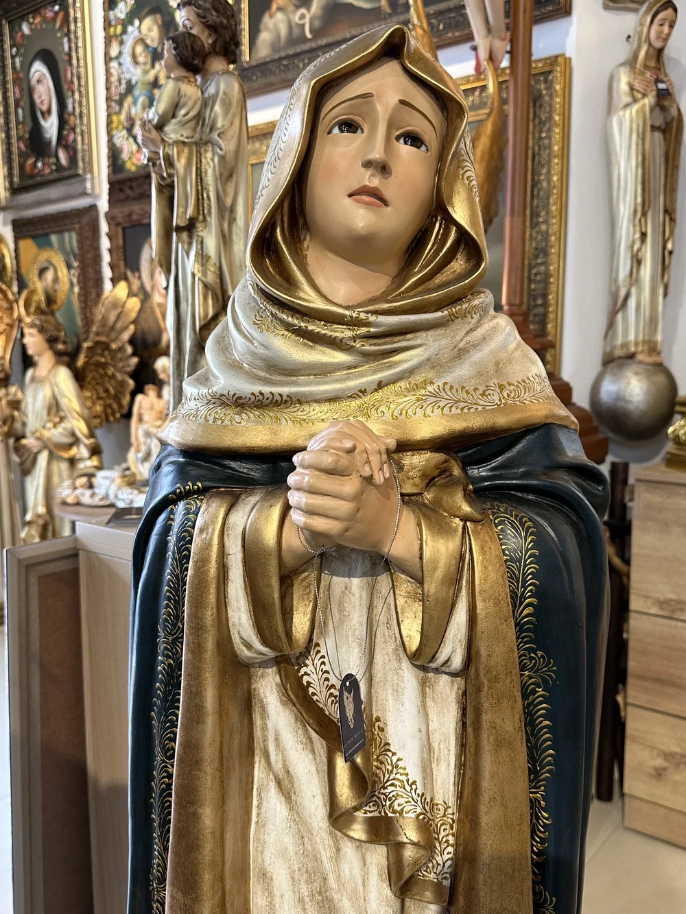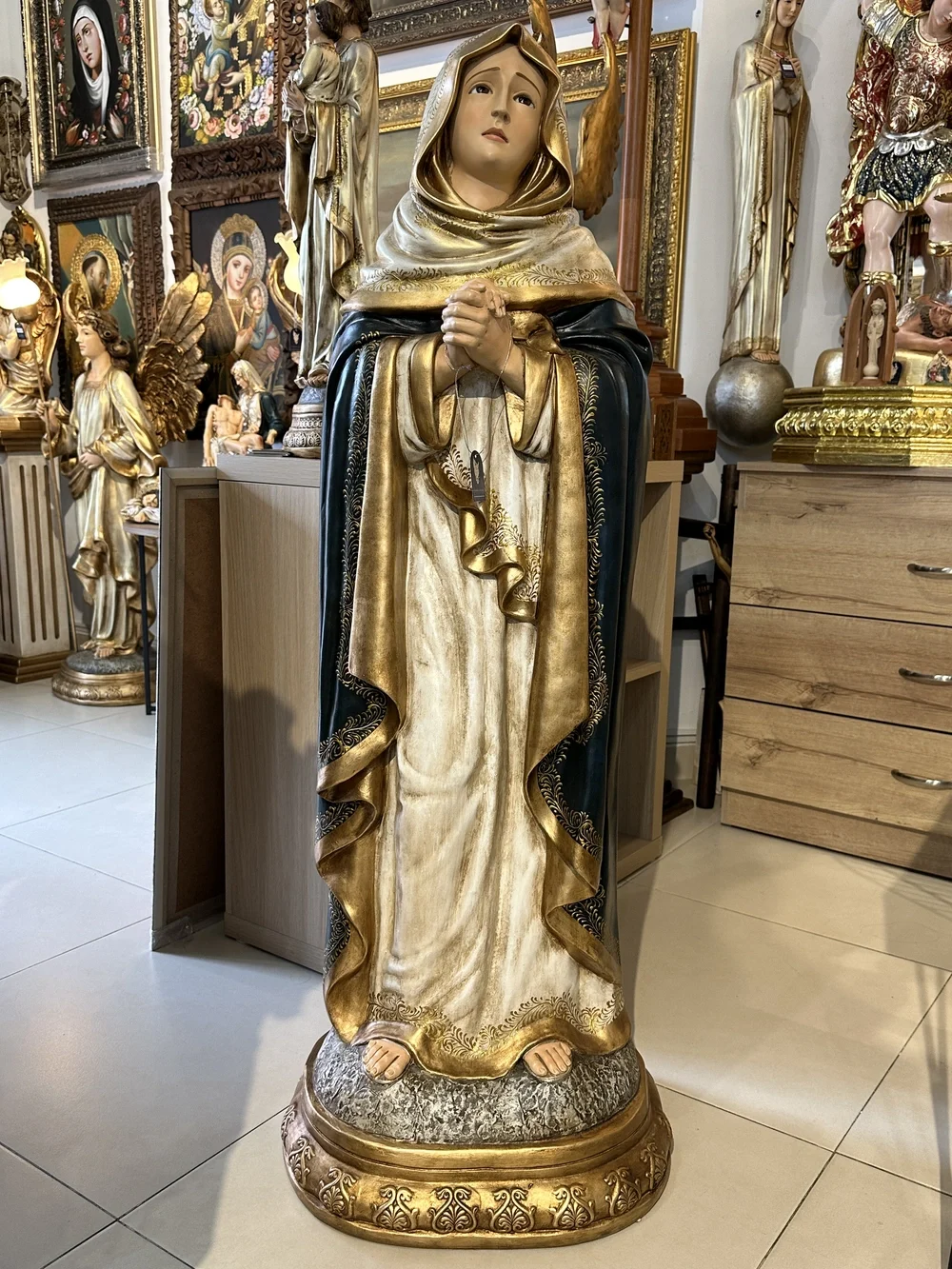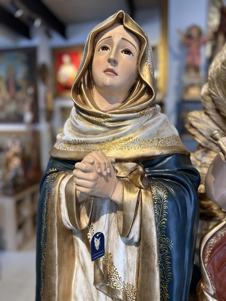 Nuestra Señora Dolorosa, conocida como la Virgen de los Dolores, es la Madre que acompaña a su Hijo en Su Pasión y Muerte. Esta conmovedora imagen de 120 cm, elaborada en fibra de vidrio de alta calidad, destaca por sus delicados detalles y la profunda expresión de su rostro. El diseño presenta un acabado con tonos oscuros y solemnes, fiel a la iconografía de la Pasión: el manto azul oscuro o negro que simboliza el luto, la tristeza y el sufrimiento. Esta paleta de colores confiere a la pieza una solemnidad atemporal y profunda, haciendo de ella un tesoro de fe y empatía.