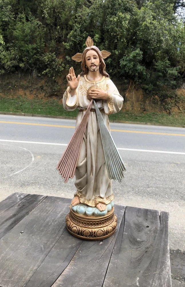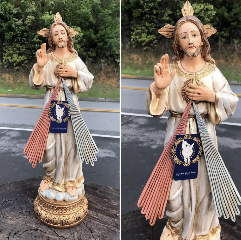 Esta obra de arte es una poderosa declaración de fe y un recordatorio visible de la infinita compasión de Cristo. Perfecta para presidir el dormitorio, el altar familiar o cualquier espacio de oración, sirviendo como centro de confianza y perdón. Gracias a la fibra de vidrio de alta calidad, esta imagen es inherentemente resistente y apta para exteriores como jardines, grutas o terrazas.