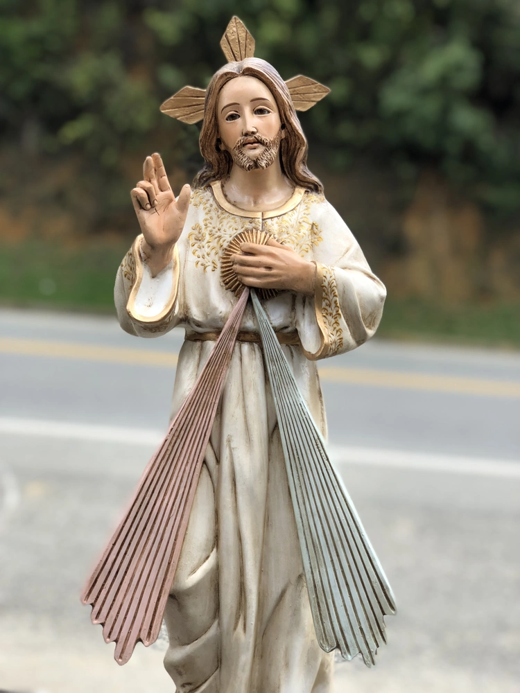 Jesús de la Divina Misericordia, comúnmente conocido como el Misericordioso, es una de las advocaciones modernas más importantes de la Iglesia Católica, basada en las revelaciones privadas a Santa Faustina Kowalska en Polonia durante el siglo XX. Esta pieza devocional elaborada en fibra de vidrio de alta resistencia, reproduce la imagen de Cristo resucitado, que se aparece con Su mano derecha levantada en gesto de bendición y Su izquierda tocando Su túnica, cerca de Su Corazón. Es el símbolo visible de la promesa de salvación y la consigna inmutable: «Jesús, en Ti confío.»
