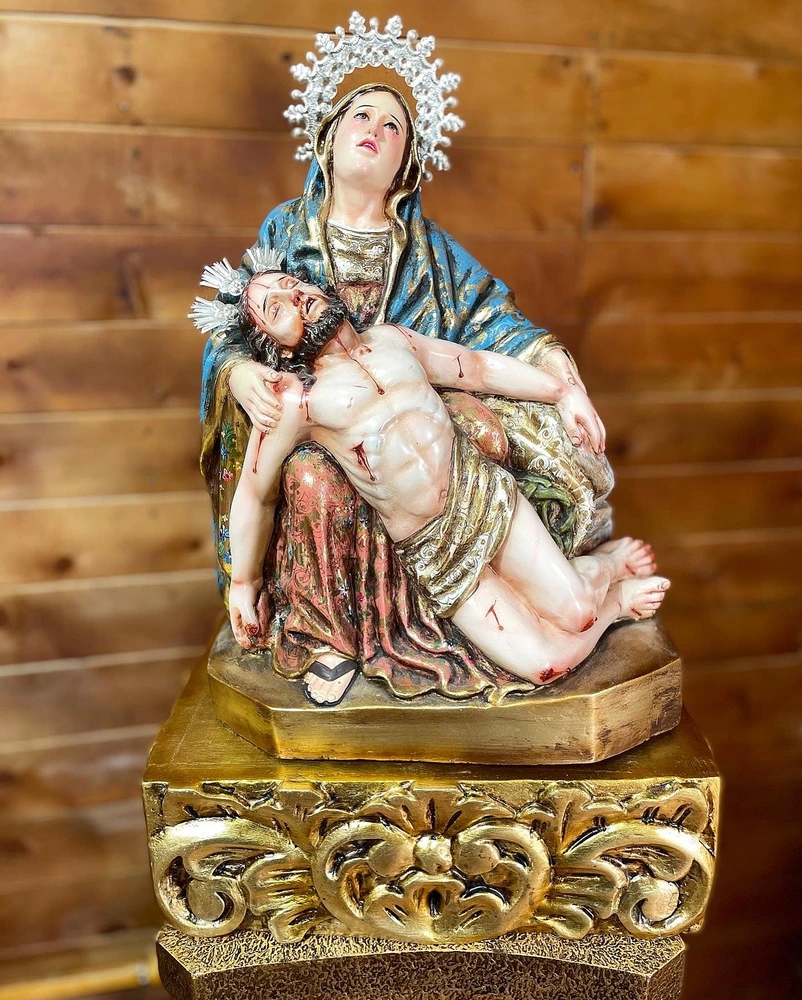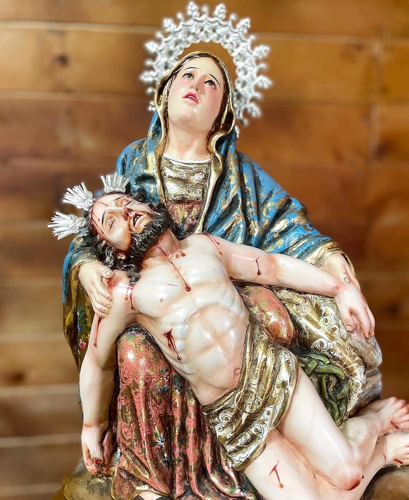 La Piedad es una de las representaciones marianas más conmovedoras, cuyo origen se remonta al arte gótico europeo. El término Pietà (piedad o compasión en italiano) se refiere al momento en que la Virgen María sostiene el cuerpo inerte de su hijo, Jesús, tras ser descendido de la Cruz. Esta advocación no solo exalta el inmenso dolor maternal, sino también la Fe y la Esperanza ante el sacrificio consumado, siendo un poderoso símbolo de consuelo.