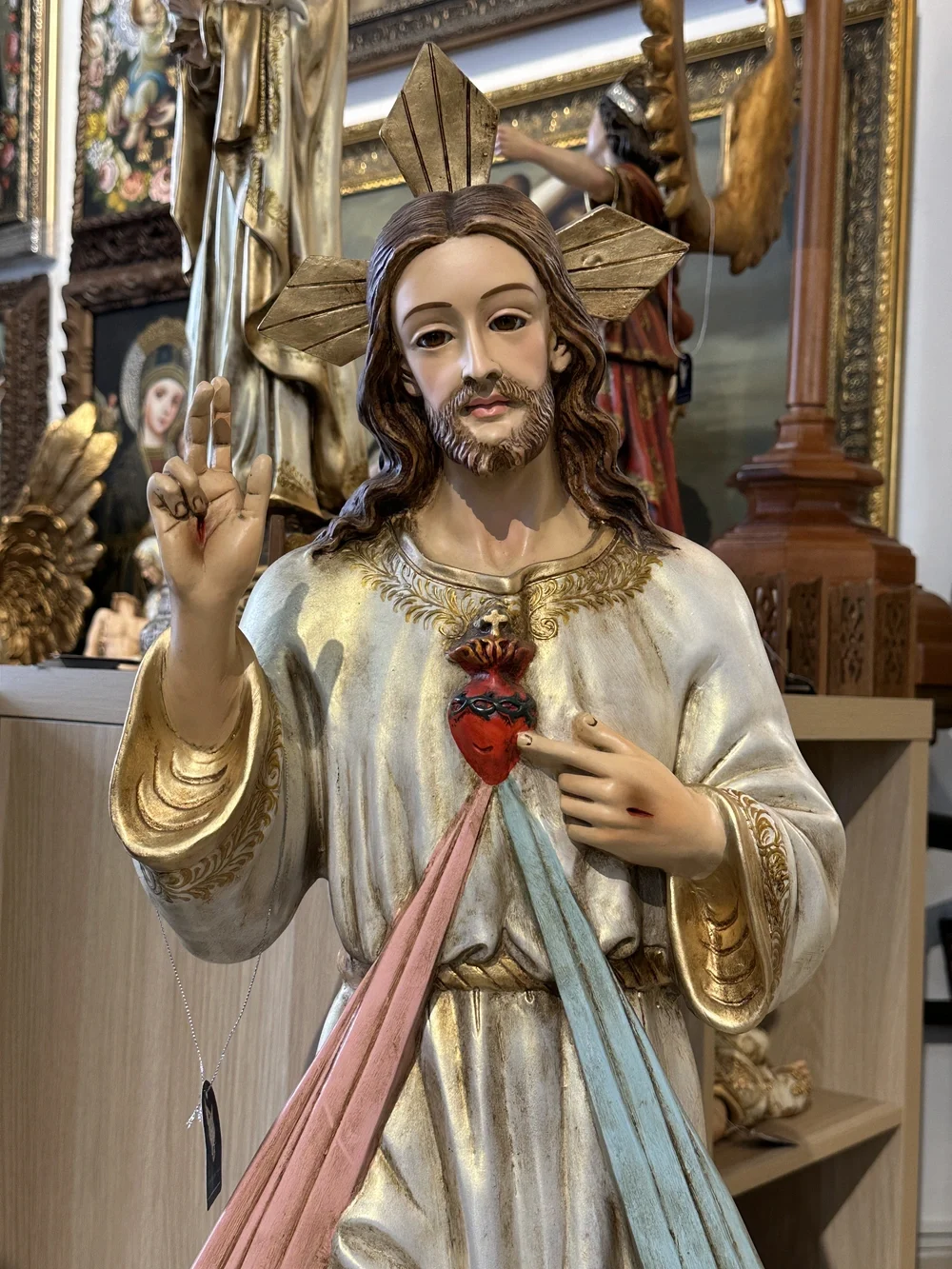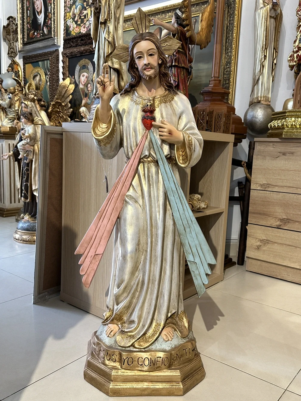 Jesús de la Divina Misericordia, comúnmente conocido como el Misericordioso, es una de las advocaciones modernas más importantes de la Iglesia Católica, basada en las revelaciones privadas a Santa Faustina Kowalska en Polonia durante el siglo XX. Esta pieza devocional de 100 cm de altura, elaborada en fibra de vidrio de alta resistencia, reproduce la imagen de Cristo resucitado, que se aparece con Su mano derecha levantada en gesto de bendición y Su izquierda tocando Su túnica, cerca de Su Corazón. Es el símbolo visible de la promesa de salvación y la consigna inmutable: «Jesús, en Ti confío.»