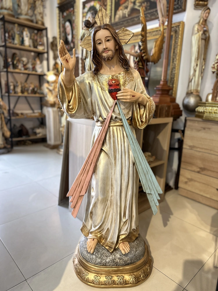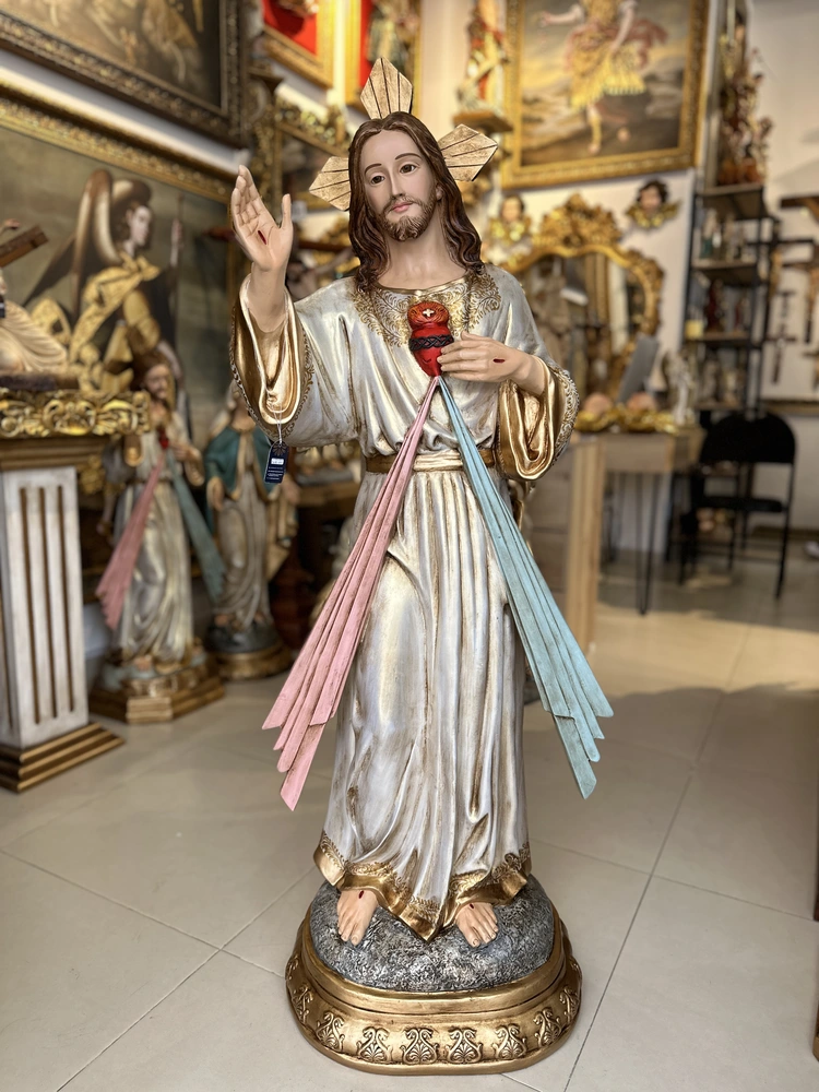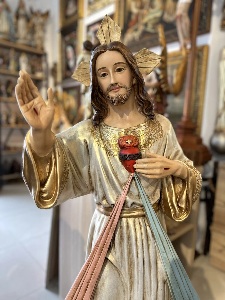 Jesús de la Divina Misericordia, comúnmente conocido como el Misericordioso, es una de las advocaciones modernas más importantes de la Iglesia Católica, basada en las revelaciones privadas a Santa Faustina Kowalska en Polonia durante el siglo XX. Esta pieza devocional de 120 cm de altura, elaborada en fibra de vidrio de alta resistencia, reproduce la imagen de Cristo resucitado, que se aparece con Su mano derecha levantada en gesto de bendición y Su izquierda tocando Su túnica, cerca de Su Corazón. Es el símbolo visible de la promesa de salvación y la consigna inmutable: «Jesús, en Ti confío.»