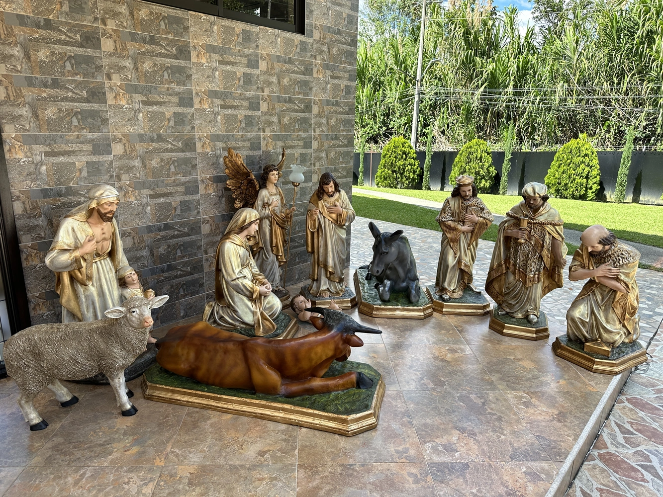 l Pesebre (Nacimiento de Jesús), es el símbolo central de la Navidad y la representación máxima de la humildad y el amor de Dios encarnado. Este emotivo conjunto de 11 piezas, con una figura principal de 110 cm de altura, elaboradas en fibra de vidrio de alta resistencia, reproduce la escena de Belén con gran distinción y detalle. Ha sido cuidadosamente terminado con tonos vibrantes y sutiles detalles en línea dorada que realzan la divinidad de la escena y le otorgan un toque de lujo. El conjunto incluye las figuras esenciales para revivir el momento cumbre de la historia de la salvación: Virgen María, San José, Niño Jesús (en cuna), Ángel de Gloria, Pastor, Oveja, Tres Reyes Magos, Buey y Mula.