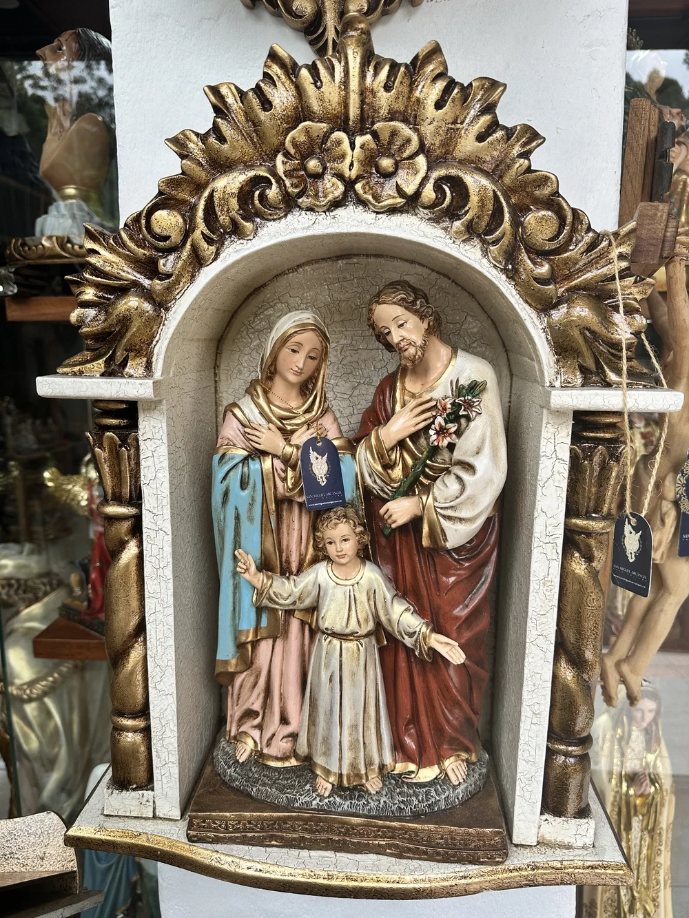 La Sagrada Familia de Nazaret, modelo sublime de virtud, unidad y protección para todos los hogares cristianos. Esta magnífica pieza de 40 cm de altura, elaborada en fibra de vidrio de alta resistencia, presenta una composición clásica y tierna, enfocada en el momento de la niñez de Jesús. Con colores ricos y tradicionales y un acabado envejecido, la escultura irradia una pátina de serenidad y bendición, convirtiéndose en el símbolo visible de la Iglesia Doméstica y de la vida de santidad en la sencillez del hogar.