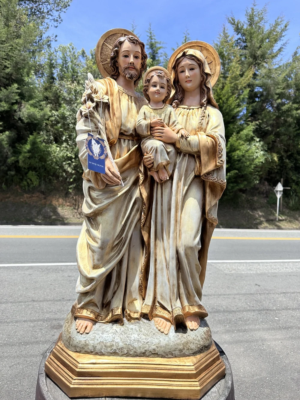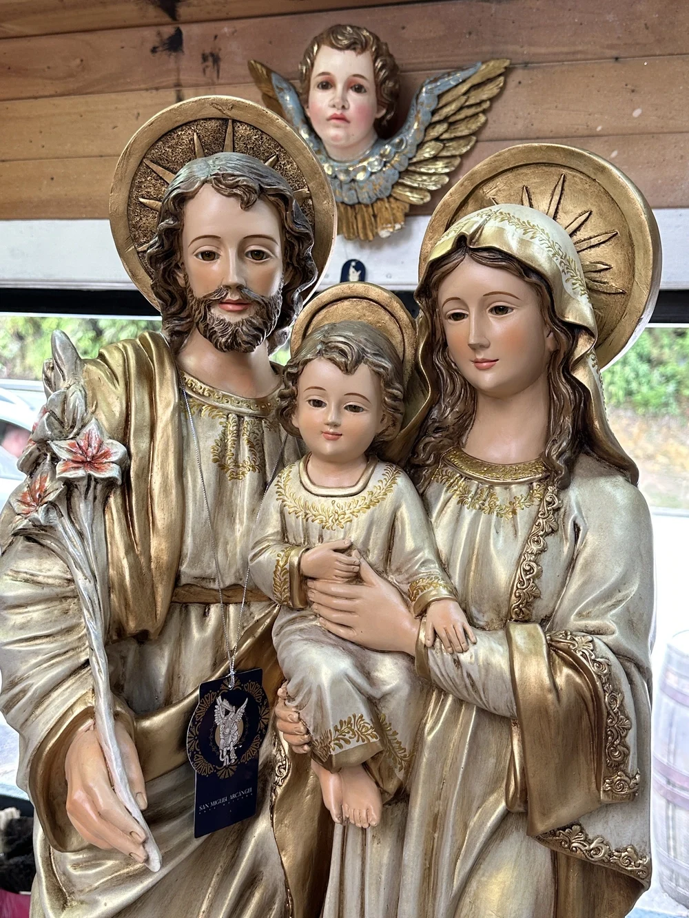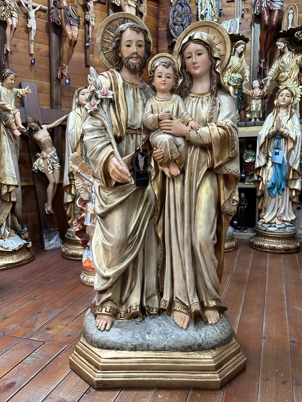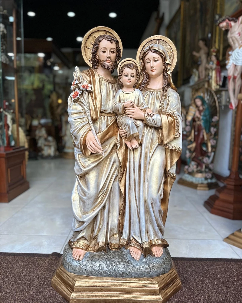 La Sagrada Familia de Nazaret, modelo sublime de virtud, unidad y protección para todos los hogares cristianos. Esta magnífica pieza de 100 cm de altura, elaborada en fibra de vidrio de alta resistencia, presenta una composición clásica y tierna, enfocada en el momento de la niñez de Jesús Su majestuosidad se realza gracias a la aplicación de tonos dorados envejecidos, irradiando una luz cálida y atemporal, símbolo visible de la Iglesia Doméstica y de la vida de santidad en la sencillez del hogar.