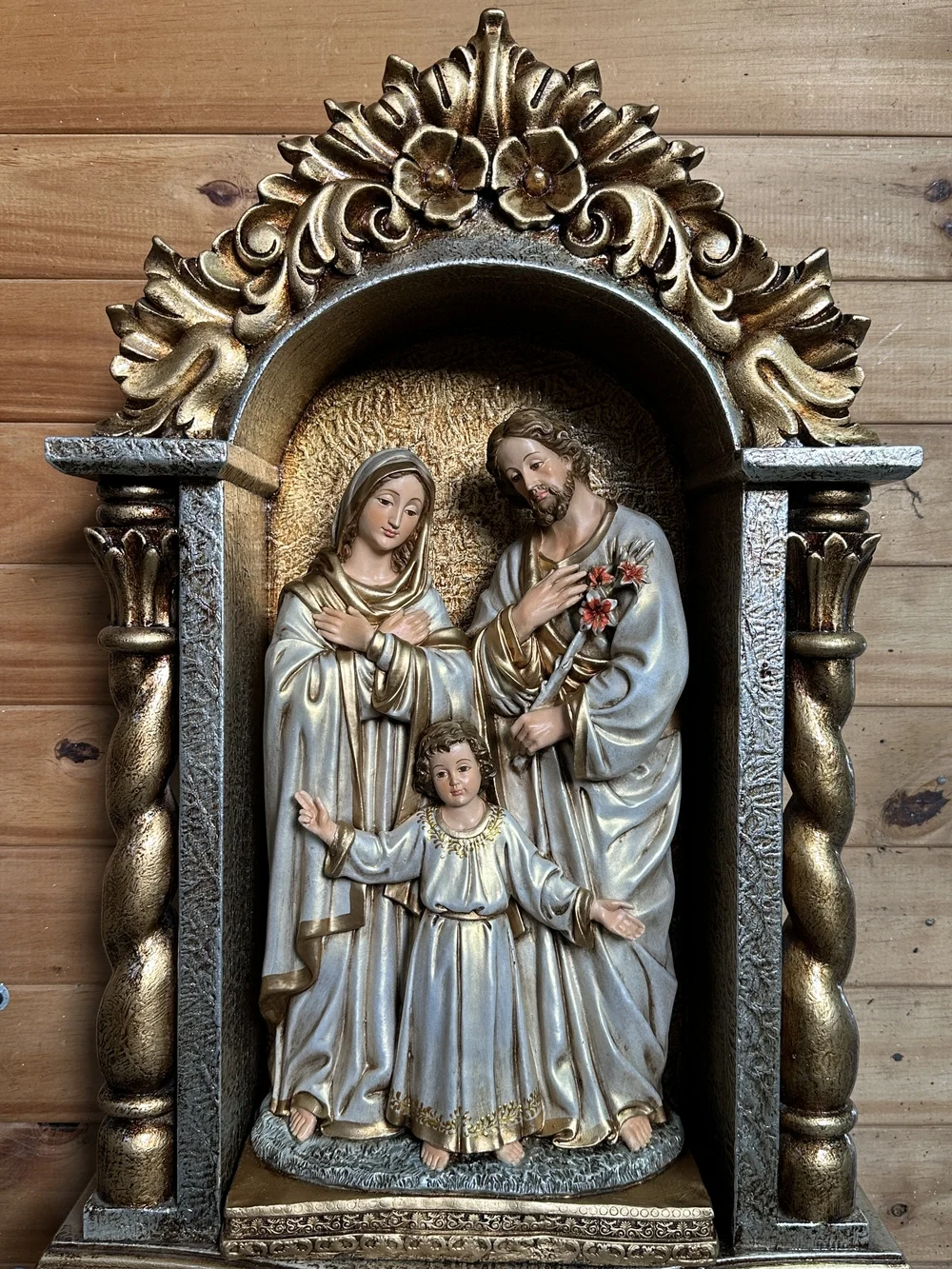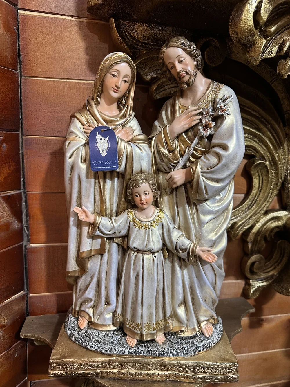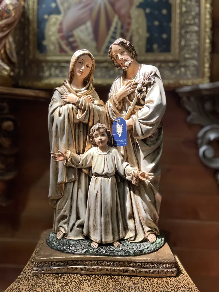 La Sagrada Familia de Nazaret, modelo sublime de virtud, unidad y protección para todos los hogares cristianos. Esta magnífica pieza de 40 cm de altura, elaborada en fibra de vidrio de alta resistencia, presenta una composición clásica y tierna, enfocada en el momento de la niñez de Jesús Su majestuosidad se realza gracias a la aplicación de tonos dorados envejecidos, irradiando una luz cálida y atemporal, símbolo visible de la Iglesia Doméstica y de la vida de santidad en la sencillez del hogar.