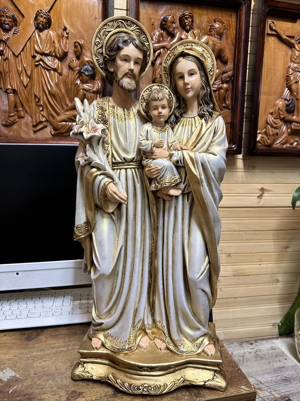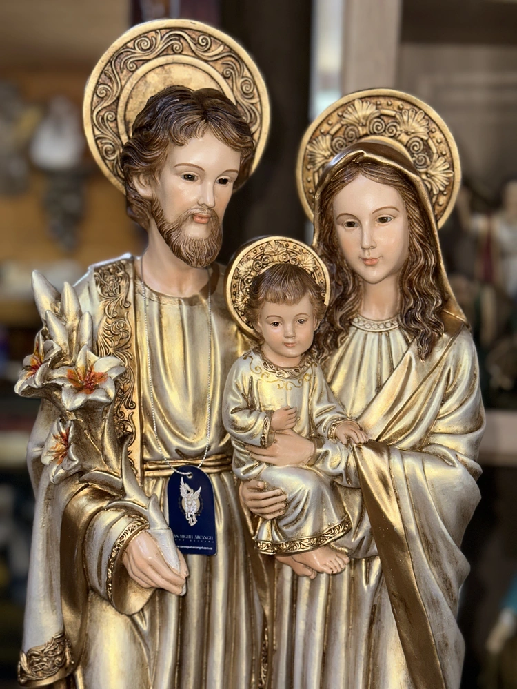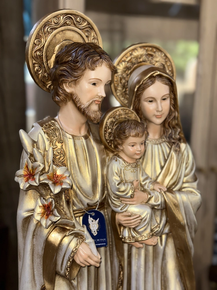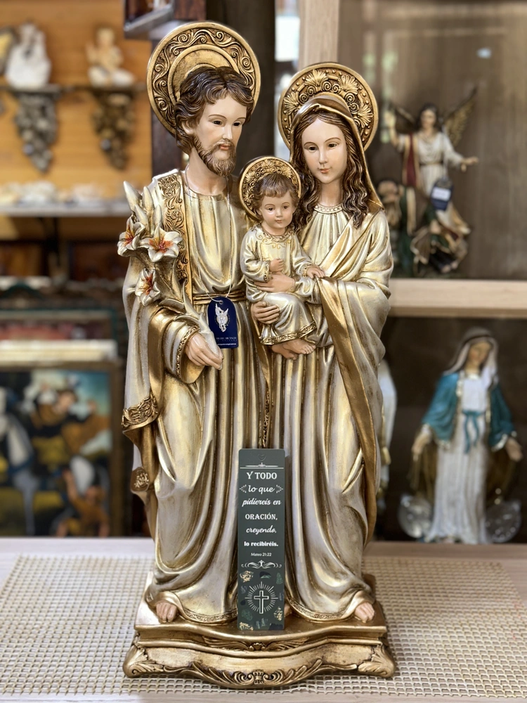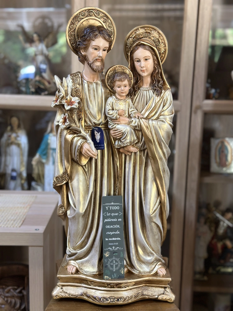 La Sagrada Familia de Nazaret, modelo sublime de virtud, unidad y protección para todos los hogares cristianos. Esta magnífica pieza de 60 cm de altura, elaborada en fibra de vidrio de alta resistencia, presenta una composición clásica y tierna, enfocada en el momento de la niñez de Jesús Su majestuosidad se realza gracias a la aplicación de tonos dorados envejecidos, irradiando una luz cálida y atemporal, símbolo visible de la Iglesia Doméstica y de la vida de santidad en la sencillez del hogar.