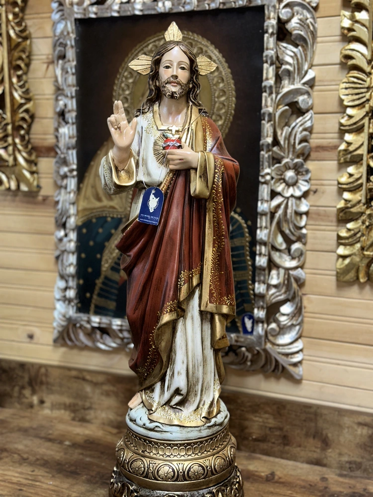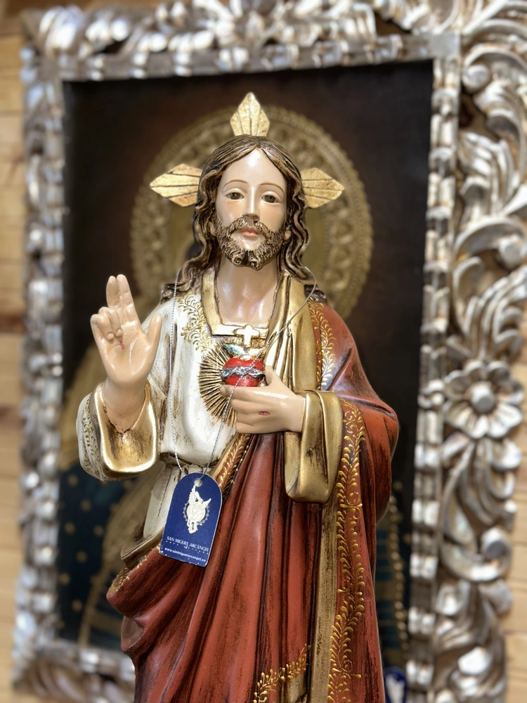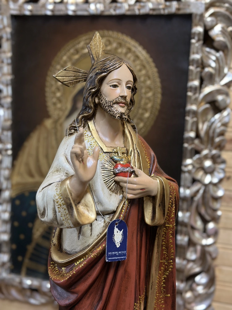 El Sagrado Corazón de Jesús, fuente de amor y misericordia, es la advocación que revela la inmensidad del amor divino por la humanidad, manifestado en Su Corazón abierto y ardiente. Esta imponente pieza de 60 cm de altura, elaborada en fibra de vidrio de alta resistencia, reproduce la imagen de Cristo con una postura que combina majestad y tierna invitación. Con colores vibrantes y profundos y un acabado que evoca realeza y solemnidad, irradia amor y misericordia. Es el símbolo visible de la Caridad infinita y la promesa de gracias especiales a quienes le honran.