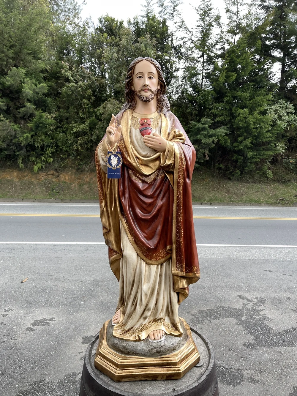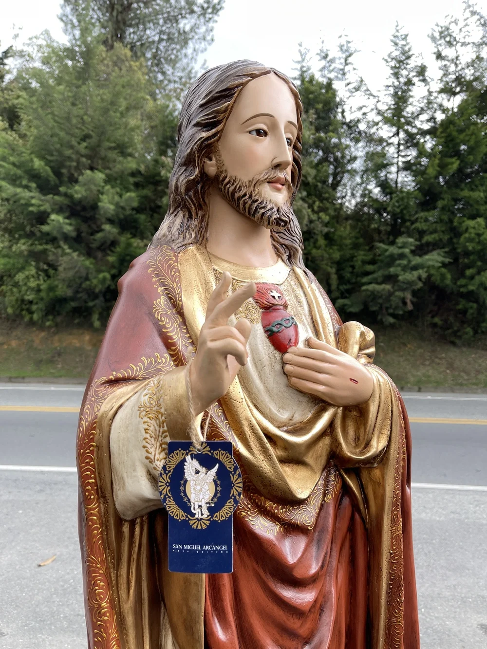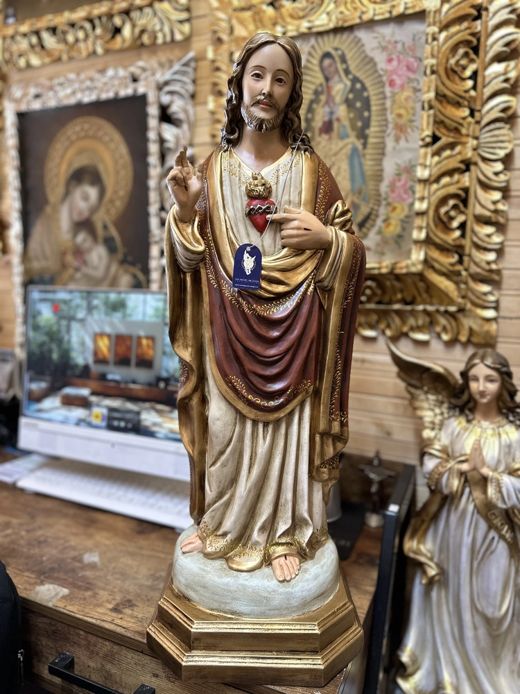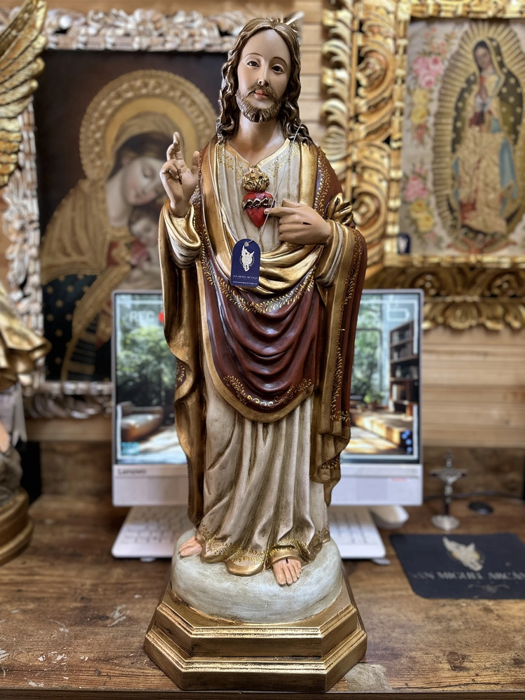 El Sagrado Corazón de Jesús, fuente de amor y misericordia, es la advocación que revela la inmensidad del amor divino por la humanidad, manifestado en Su Corazón abierto y ardiente. Esta imponente pieza elaborada en fibra de vidrio de alta resistencia, reproduce la imagen de Cristo con una postura que combina majestad y tierna invitación. Con colores vibrantes y profundos y un acabado que evoca realeza y solemnidad, irradia amor y misericordia. Es el símbolo visible de la Caridad infinita y la promesa de gracias especiales a quienes le honran.