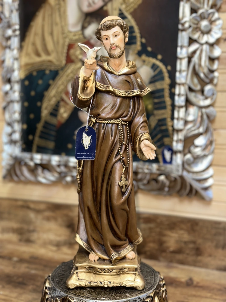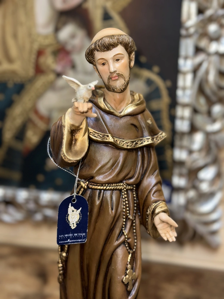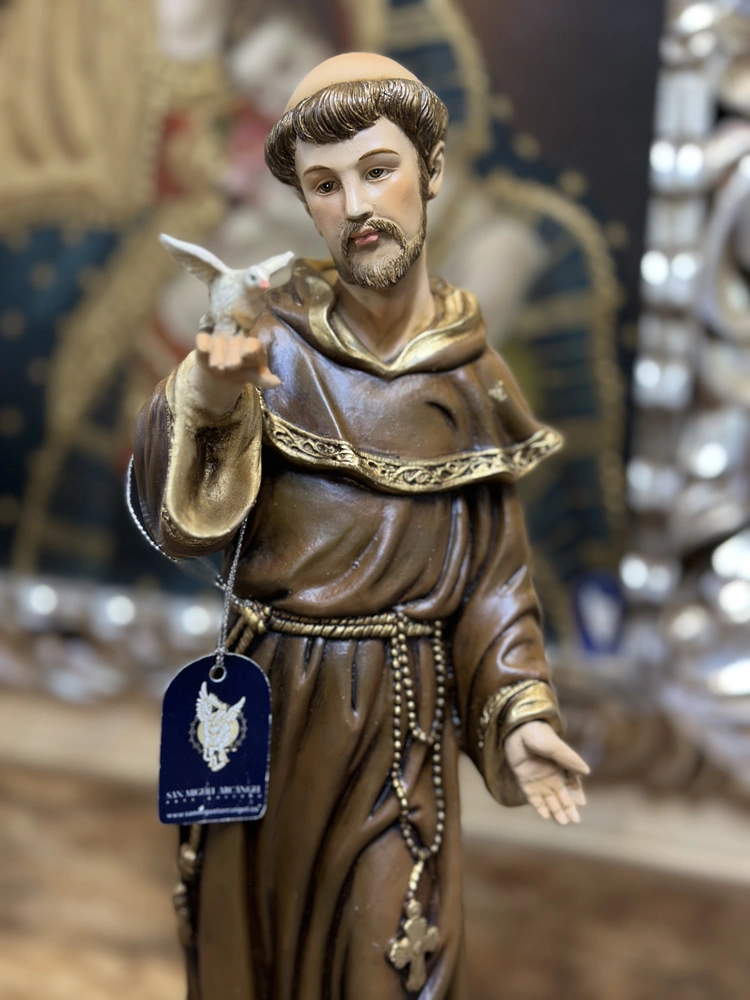 San Antonio de Padua es uno de los santos franciscanos más venerados del mundo, conocido como el «Santo de todo el mundo» y célebre por su sabiduría, sus milagros y su profunda caridad. Esta pieza devocional de 40 cm de altura, elaborada en fibra de vidrio de alta resistencia, reproduce la figura del fraile portugués, vestido con el hábito franciscano y sosteniendo tiernamente al Niño Jesús en sus brazos. Con colores sobrios que evocan su vida de pobreza y un acabado de dulzura y devoción, la escultura irradia una profunda paz y fe. Es el símbolo visible de la predicación incansable y la intimidad con Cristo que el santo alcanzó, siendo invocado como intercesor en las necesidades más apremiantes.