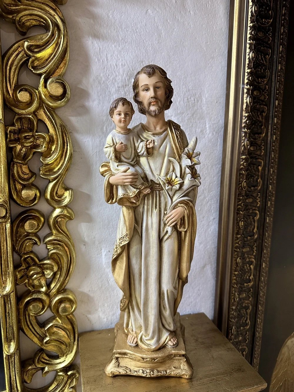 La iconografía de San José se centra en su rol silencioso pero esencial en la historia de la salvación, donde el Niño Jesús que a menudo carga es el símbolo más poderoso de su paternidad terrenal y rol como Custodio de la Sagrada Familia; la Vara Florida con Lirios lo distingue como el elegido por Dios y representa su pureza y castidad.
