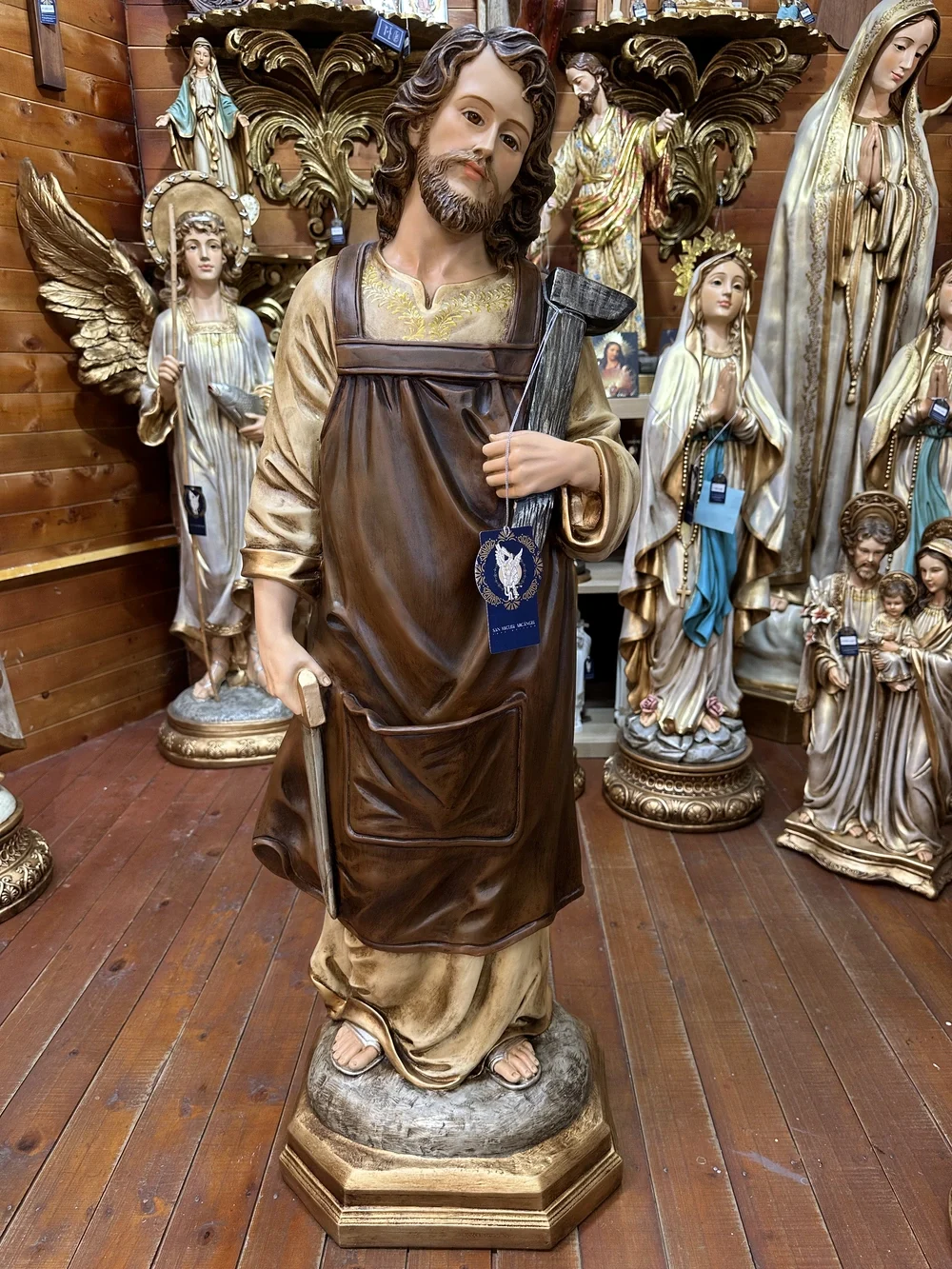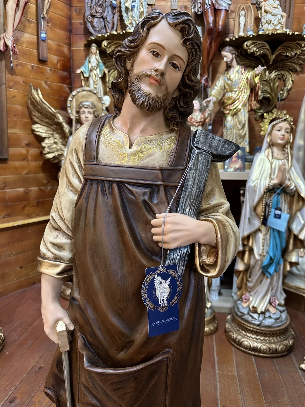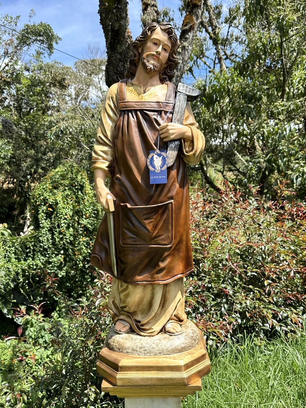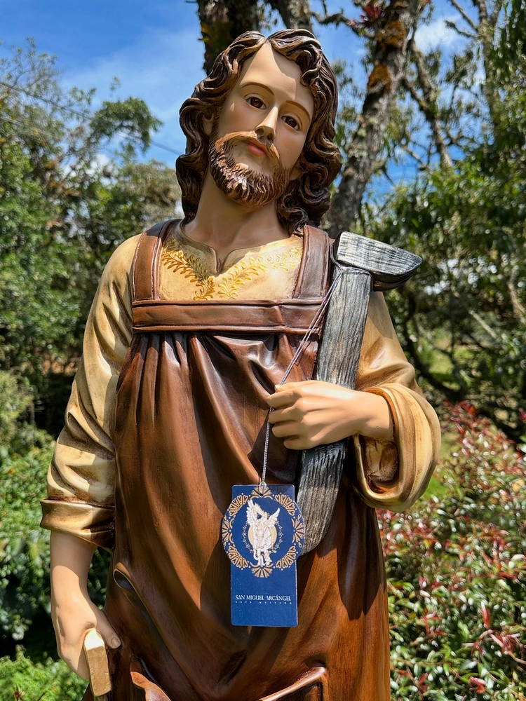 San José Obrero se centra enteramente en la dignidad del trabajo humano y su papel como patrono de los trabajadores. La vestimenta de overol sustituye el tradicional manto y túnica, marcando su identidad no solo como Custodio de la Sagrada Familia, sino como un humilde artesano que santificó su vida a través del esfuerzo manual. Las herramientas de carpintería son el foco de la iconografía, simbolizando la provisión, la honestidad y la disciplina de su oficio.
