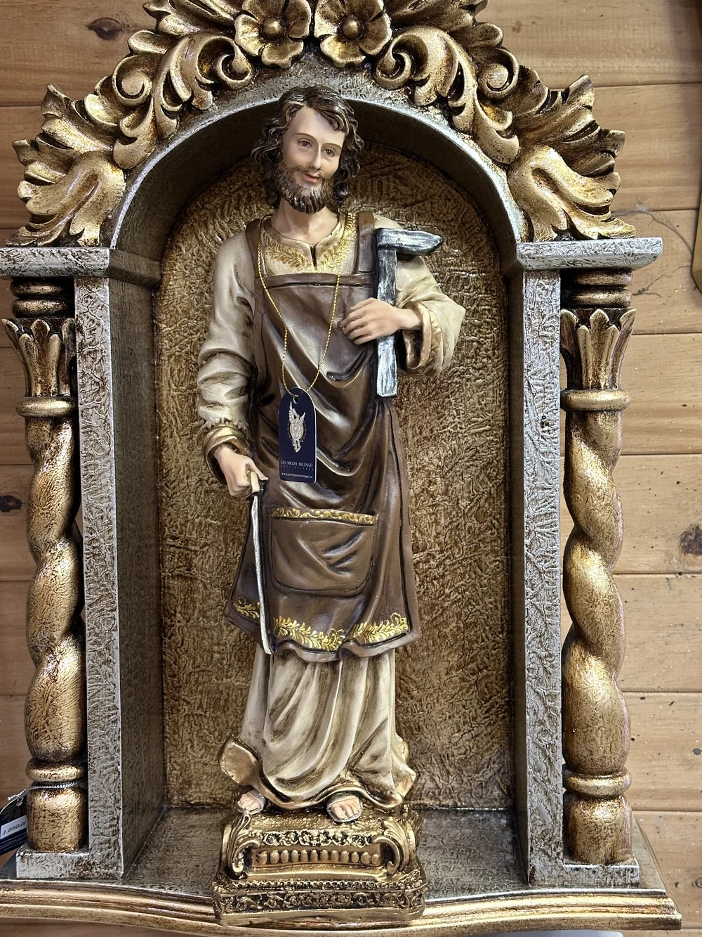 Esta pieza es una obra de arte que evoca la fidelidad, la providencia y la dignidad del trabajo. Perfecta para presidir la oficina o taller, para embellecer un altar familiar, o cualquier rincón de tu hogar donde se desee un constante recordatorio de la necesidad de confiar en la providencia y la protección paternal. Es un regalo sumamente apropiado para padres, cónyuges, o cualquier persona que busque la santificación en su labor diaria.