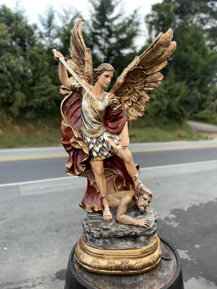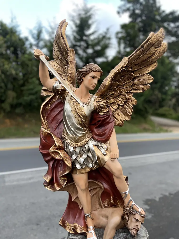 San Miguel Arcángel, el Guerrero Celestial. Esta imponente imagen de 100 cm, elaborada en fibra de vidrio de alta calidad, destaca por sus detalles y ligereza. El diseño presenta un acabado con tonos tradicionales y vibrantes, fiel a la iconografía: el manto rojo símbolo de la fuerza divina, la armadura resplandeciente que evoca la luz de Dios, y los tonos azules y blancos que representan la pureza, la lealtad y el cielo. Esta paleta de colores confiere a la pieza un carácter atemporal y profundo, haciendo de ella un tesoro de fe y devoción.