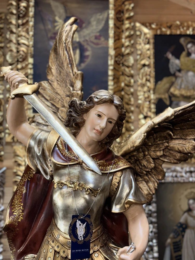 San Miguel Arcángel, el Guerrero Celestial. Esta imponente imagen de 120 cm, elaborada en fibra de vidrio de alta calidad, destaca por sus detalles y ligereza. El diseño presenta un acabado con tonos tradicionales y vibrantes, fiel a la iconografía: el manto rojo símbolo de la fuerza divina, la armadura resplandeciente que evoca la luz de Dios, y los tonos azules y blancos que representan la pureza, la lealtad y el cielo. Esta paleta de colores confiere a la pieza un carácter atemporal y profundo, haciendo de ella un tesoro de fe y devoción.