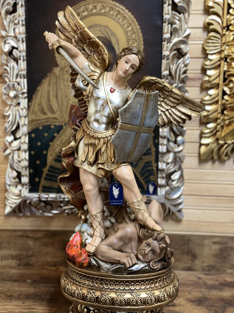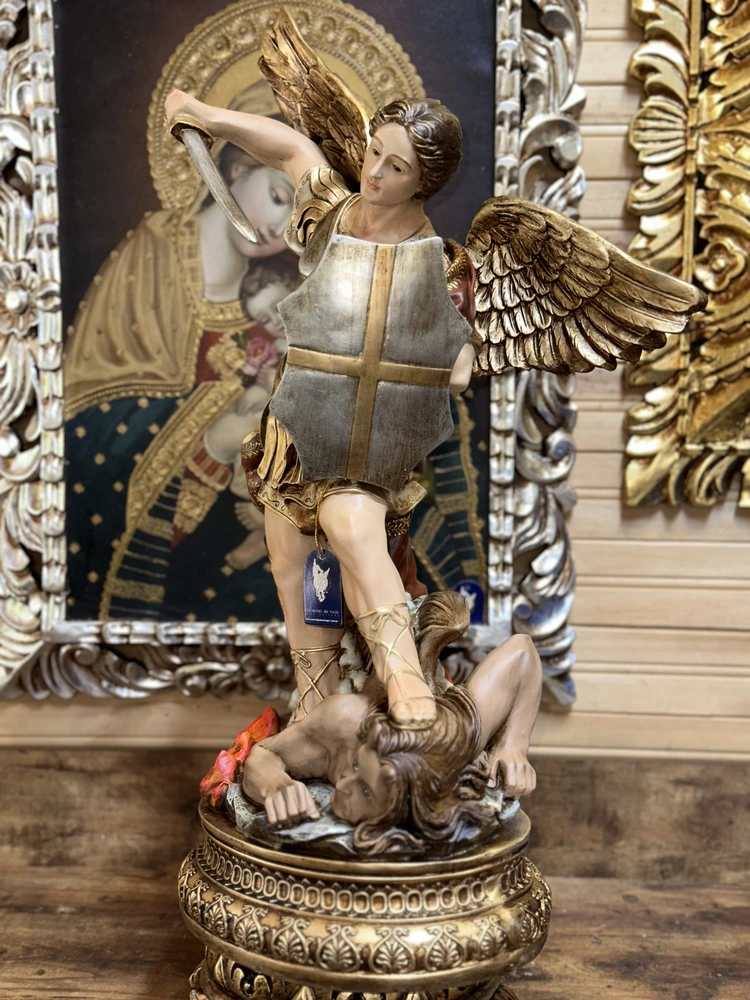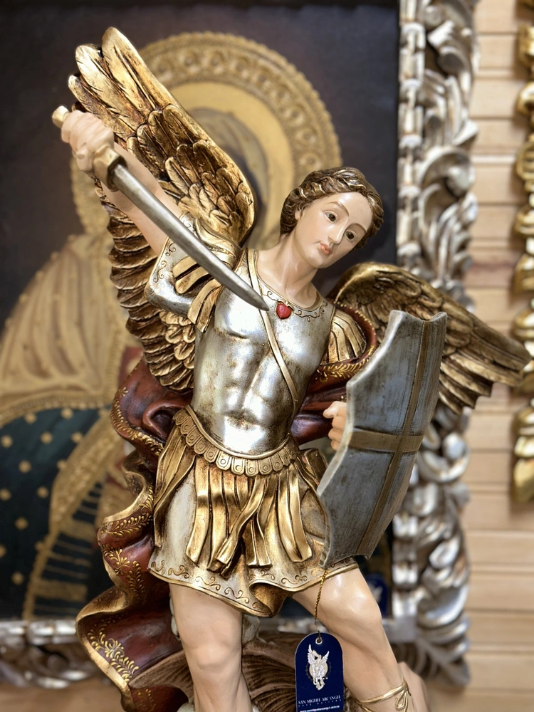 Su nombre significa “¿Quién como Dios?”. Esta representación única lleva consigo elementos clave de su ministerio: La Lanza simboliza la autoridad y la fuerza ejecutora de Dios, con la que triunfa al pisotear al demonio, representando la victoria de la luz sobre las fuerzas oscuras. La Balanza simboliza la justicia divina, el equilibrio moral y su papel como intercesor en la salvación. Su Armadura y Colores tradicionales representan la protección, la luz de Dios y la fidelidad absoluta.