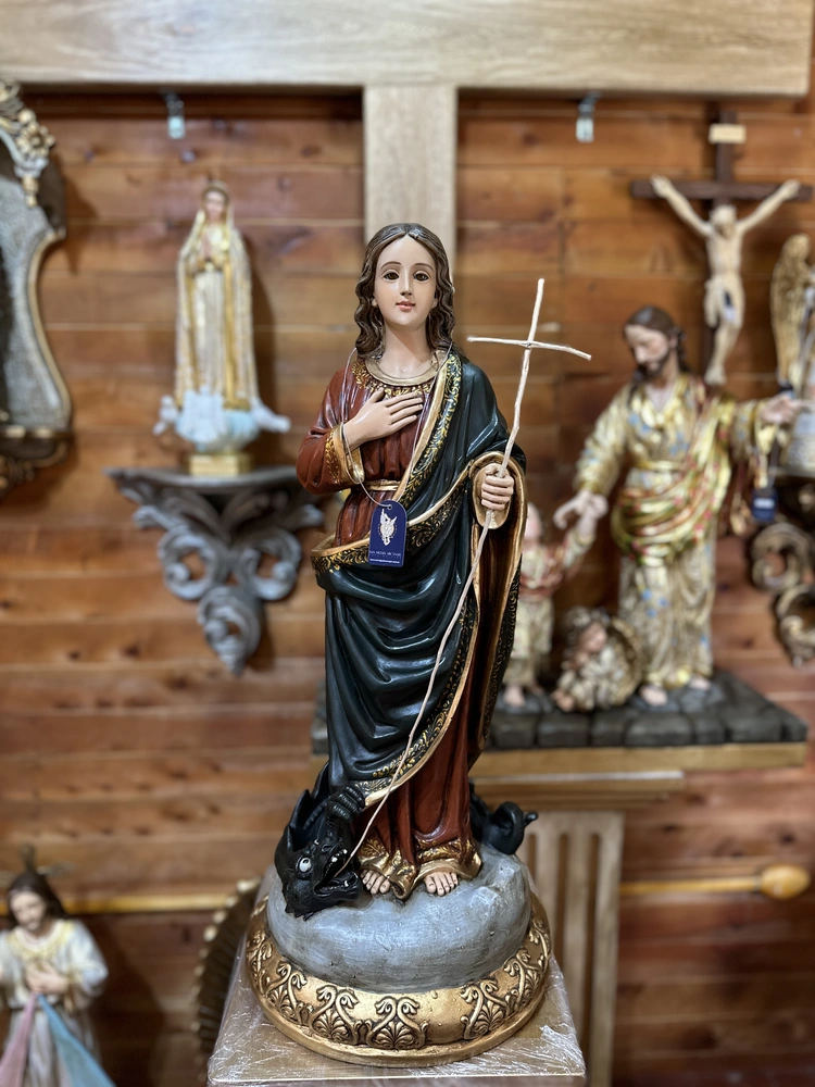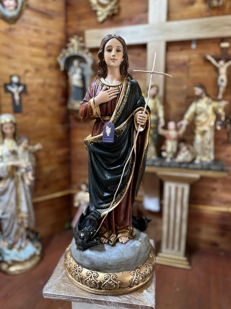 Santa Marta de Betania es la amiga de Jesús, recordada en los Evangelios por su gran hospitalidad y su intensa dedicación al servicio. Hermana de María y Lázaro, es el modelo bíblico de la mujer activa, de acción y de una fe inquebrantable, que llegó a proclamar a Jesús como «el Cristo, el Hijo de Dios». Esta pieza devocional de 60 cm de altura, elaborada en fibra de vidrio de alta resistencia, reproduce la figura de Marta, a menudo vestida con túnicas sencillas y en una pose que evoca la diligencia y la fortaleza.