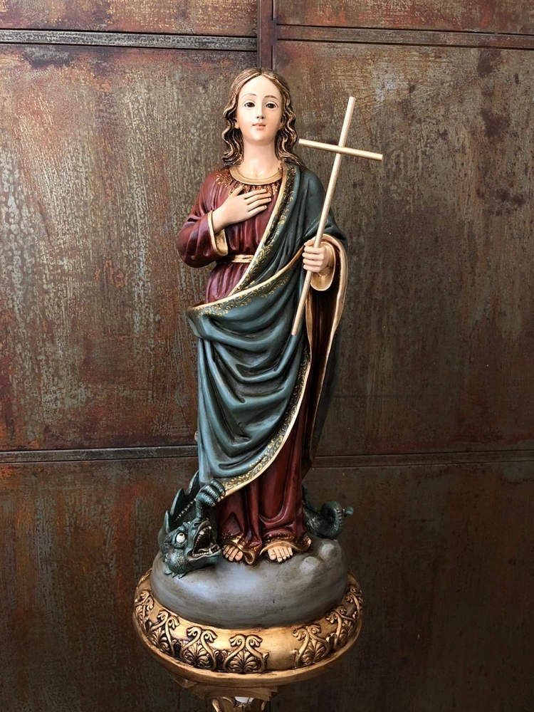 La iconografía de Santa Marta se centra en sus roles bíblicos y en una leyenda medieval que destaca su fortaleza. Es común verla vestida con un delantal, que simboliza su incansable labor en el hogar y su rol como ama de casa y anfitriona. A menudo lleva un manojo de llaves a la cintura, atributo que la identifica como la jefa del hogar. El símbolo más dramático es el dragón o la tarasca rendida a sus pies, que representa su victoria sobre el mal y la fortaleza de su fe, con la que sometió a una mítica bestia en la Provenza francesa, mostrando su poder sobre lo imposible.