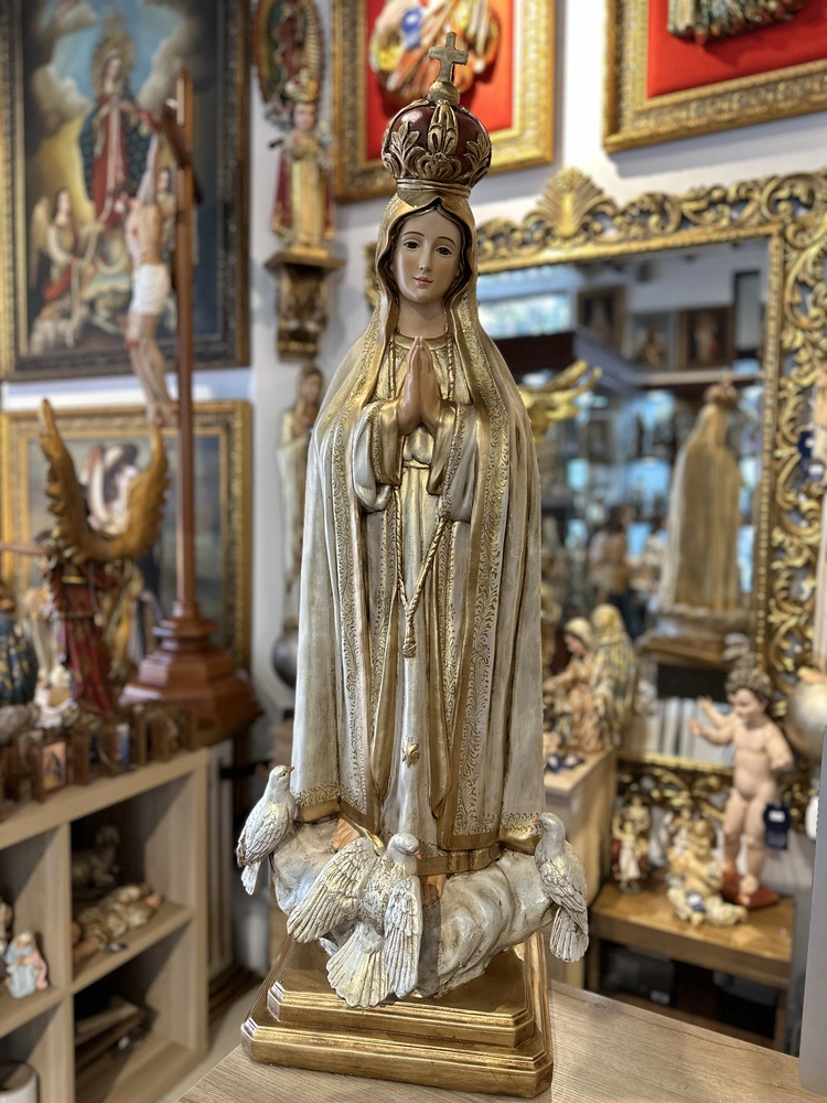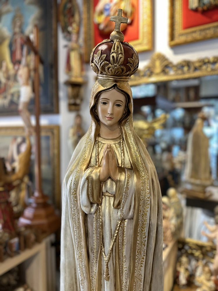 Nuestra Señora de Fátima, cuyo nombre oficial es Nuestra Señora del Rosario de Fátima, conmemora las apariciones marianas en Cova de Iría, Portugal, en 1917. Esta imponente imagen de 100 cm, elaborada en fibra de vidrio de alta calidad, destaca por sus delicados detalles y ligereza, diseñada para ser un recordatorio constante de su mensaje profético. El diseño presenta un acabado con tonos puros y profundos, fiel a su iconografía: la túnica blanca, que simboliza su pureza inmaculada, y el manto blanco o crema, que representa la luz de la Gracia. Esta paleta de colores confiere a la pieza una majestuosidad celestial y serena, haciendo de ella un faro de fe y esperanza.