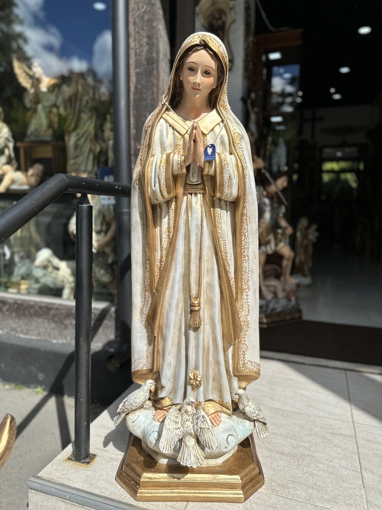 Nuestra Señora de Fátima, cuyo nombre oficial es Nuestra Señora del Rosario de Fátima, conmemora las apariciones marianas en Cova de Iría, Portugal, en 1917. Esta imponente imagen de 120 cm, elaborada en fibra de vidrio de alta calidad, destaca por sus delicados detalles y ligereza, diseñada para ser un recordatorio constante de su mensaje profético. El diseño presenta un acabado con tonos puros y profundos, fiel a su iconografía: la túnica blanca, que simboliza su pureza inmaculada, y el manto blanco o crema, que representa la luz de la Gracia. Esta paleta de colores confiere a la pieza una majestuosidad celestial y serena, haciendo de ella un faro de fe y esperanza.