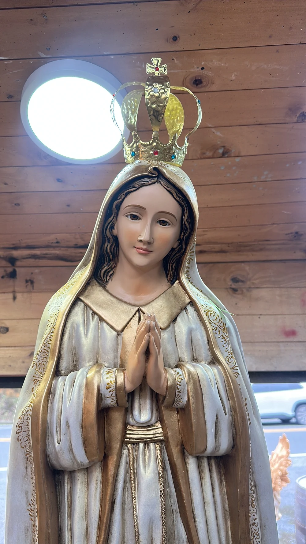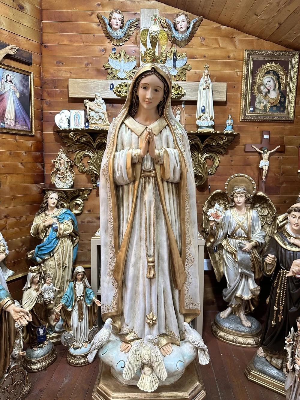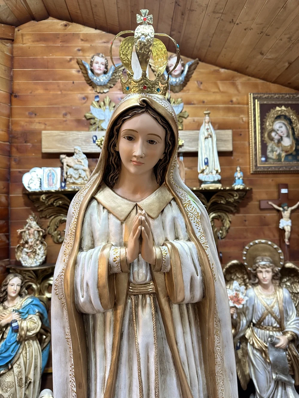 Esta pieza es una obra de arte que evoca la gracia y la intercesión de la Madre de Dios. Perfecta para presidir el altar mayor o lateral de iglesias, capillas y centros espirituales. Gracias a la fibra de vidrio de alta calidad, la imagen es inherentemente resistente y apta para cualquier ubicación, ya sea en salones y altares familiares, o en exteriores como atrios, jardines y grutas.
