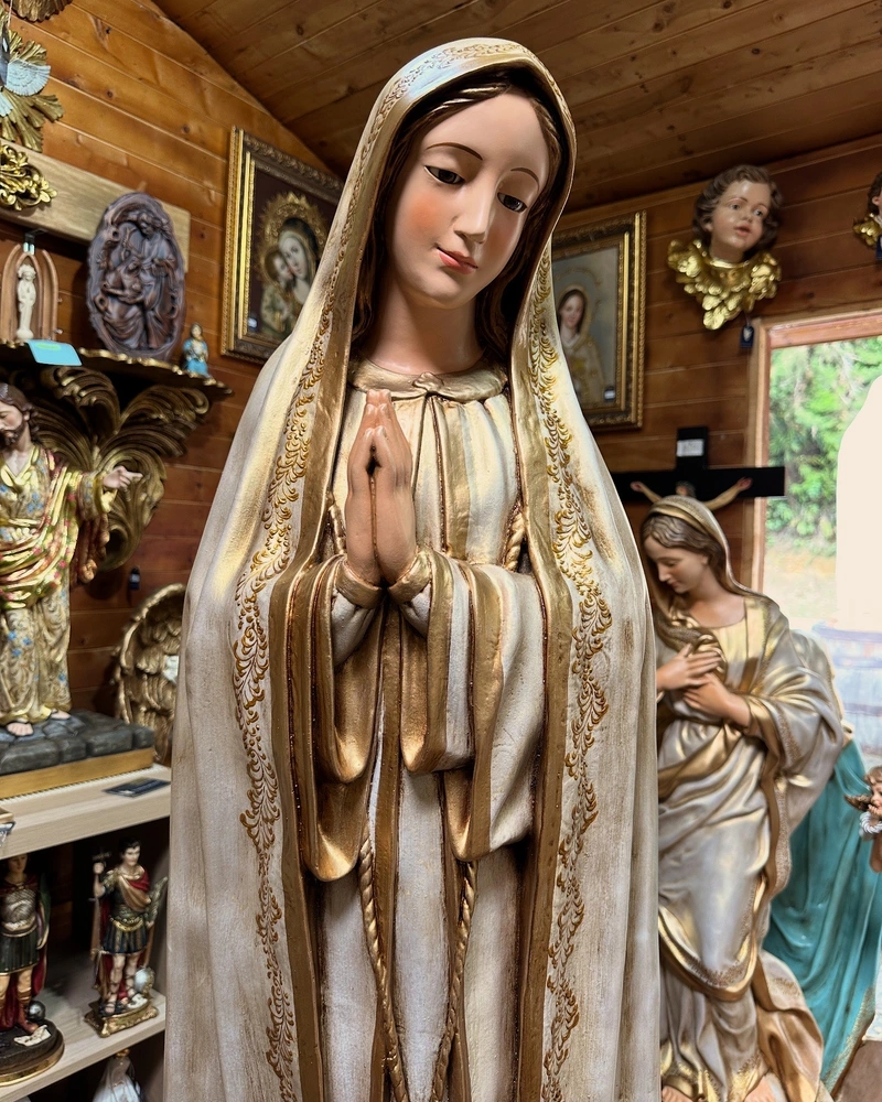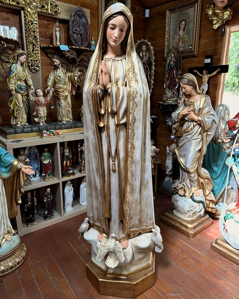 Nuestra Señora de Fátima, cuyo nombre oficial es Nuestra Señora del Rosario de Fátima, conmemora las apariciones marianas en Cova de Iría, Portugal, en 1917. Esta imponente imagen de 150 cm, elaborada en fibra de vidrio de alta calidad, destaca por sus delicados detalles y ligereza, diseñada para ser un recordatorio constante de su mensaje profético. El diseño presenta un acabado con tonos puros y profundos, fiel a su iconografía: la túnica blanca, que simboliza su pureza inmaculada, y el manto blanco o crema, que representa la luz de la Gracia. Esta paleta de colores confiere a la pieza una majestuosidad celestial y serena, haciendo de ella un faro de fe y esperanza.
