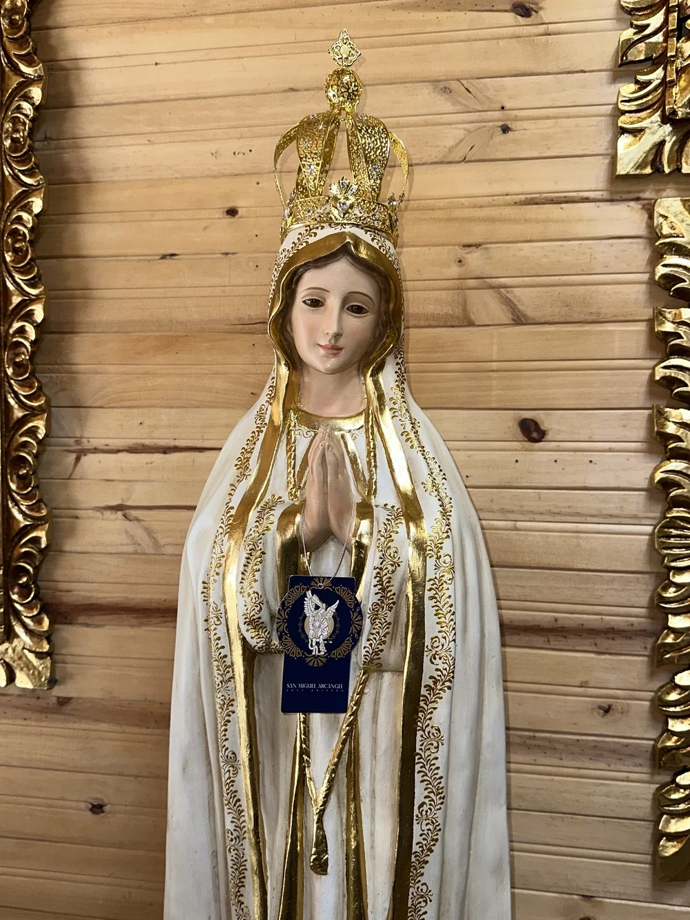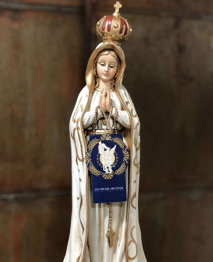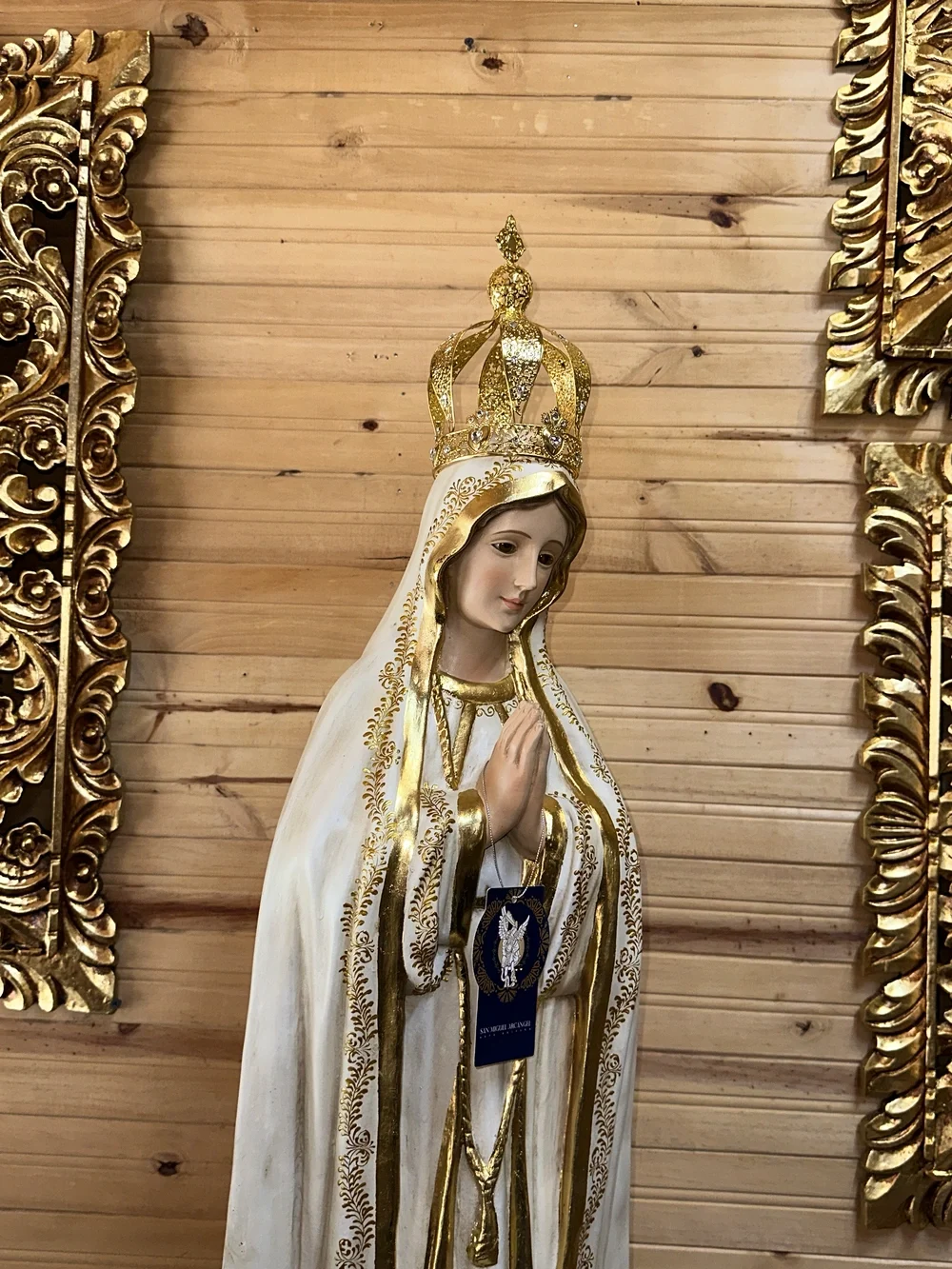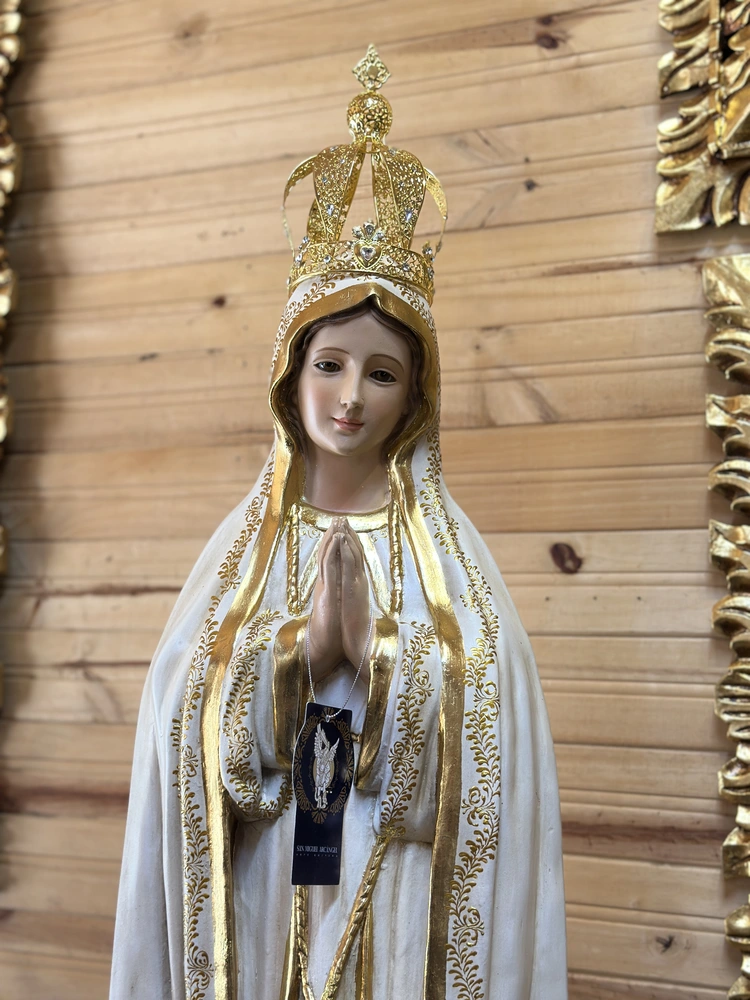 Nuestra Señora de Fátima, cuyo nombre oficial es Nuestra Señora del Rosario de Fátima, conmemora las apariciones marianas en Cova de Iría, Portugal, en 1917. Esta imponente imagen elaborada en fibra de vidrio de alta calidad, destaca por sus delicados detalles y ligereza, diseñada para ser un recordatorio constante de su mensaje profético. El diseño presenta un acabado con tonos puros y profundos, fiel a su iconografía: la túnica blanca, que simboliza su pureza inmaculada, y el manto blanco o crema, que representa la luz de la Gracia. Esta paleta de colores confiere a la pieza una majestuosidad celestial y serena, haciendo de ella un faro de fe y esperanza.