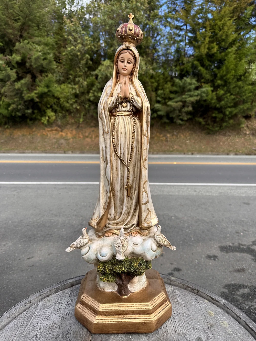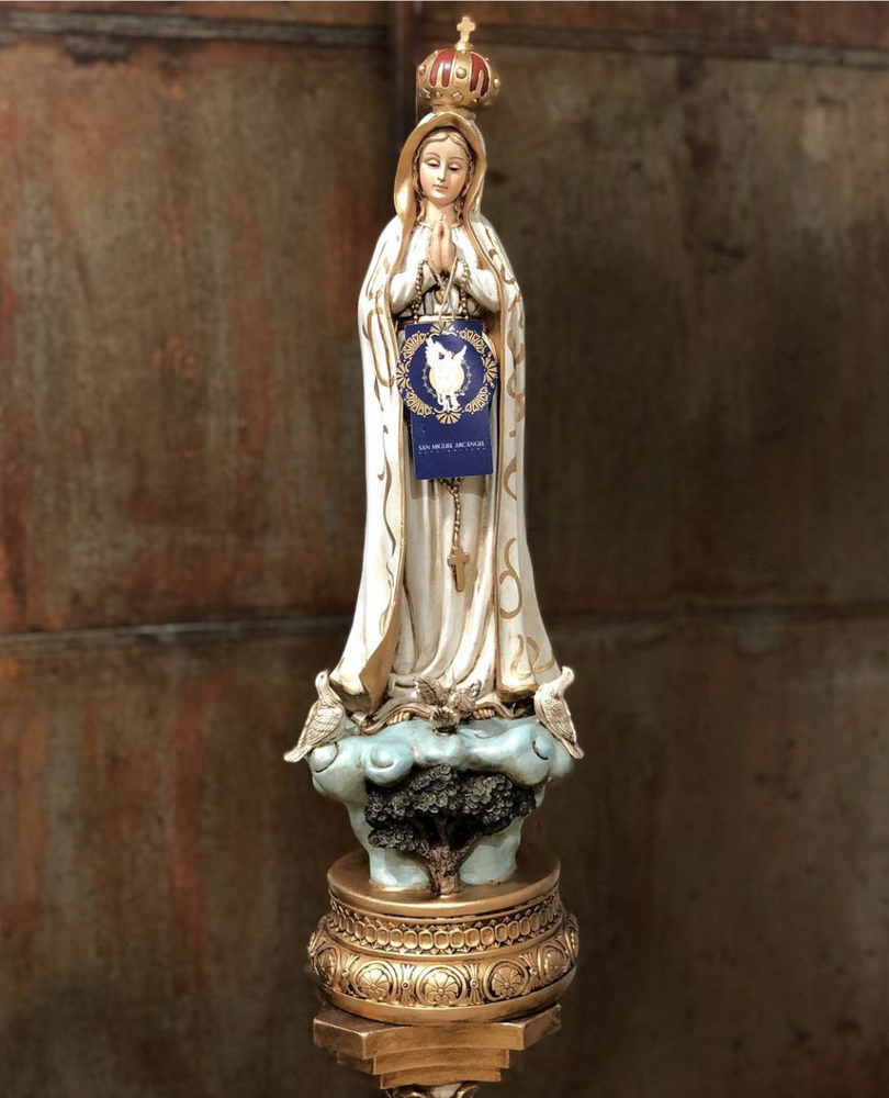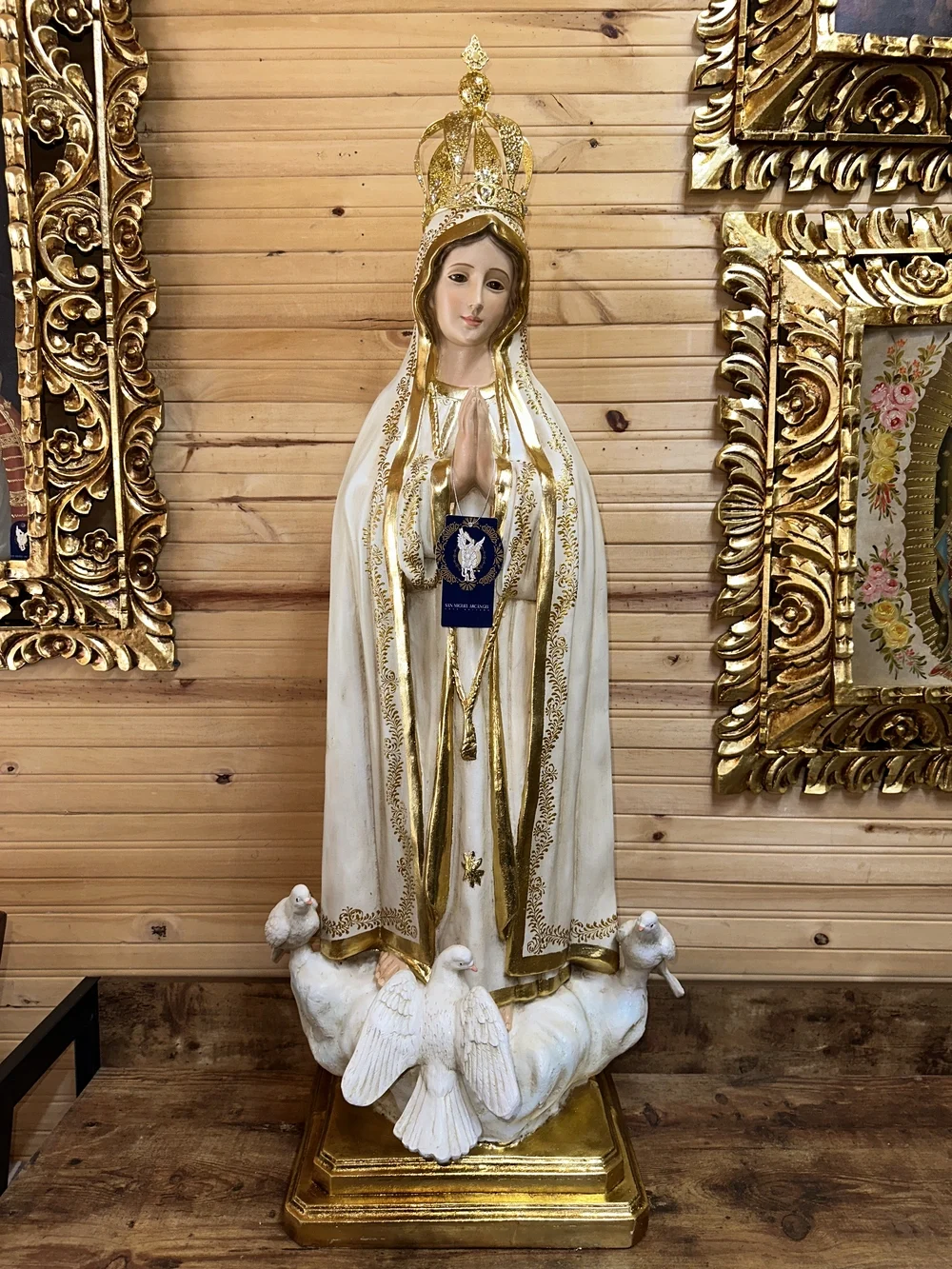 Nuestra Señora de Fátima, cuyo nombre oficial es Nuestra Señora del Rosario de Fátima, conmemora las apariciones marianas en Cova de Iría, Portugal, en 1917. Esta imponente imagen elaborada en fibra de vidrio de alta calidad, destaca por sus delicados detalles y ligereza, diseñada para ser un recordatorio constante de su mensaje profético. El diseño presenta un acabado con tonos puros y profundos, fiel a su iconografía: la túnica blanca, que simboliza su pureza inmaculada, y el manto blanco o crema, que representa la luz de la Gracia. Esta paleta de colores confiere a la pieza una majestuosidad celestial y serena, haciendo de ella un faro de fe y esperanza.