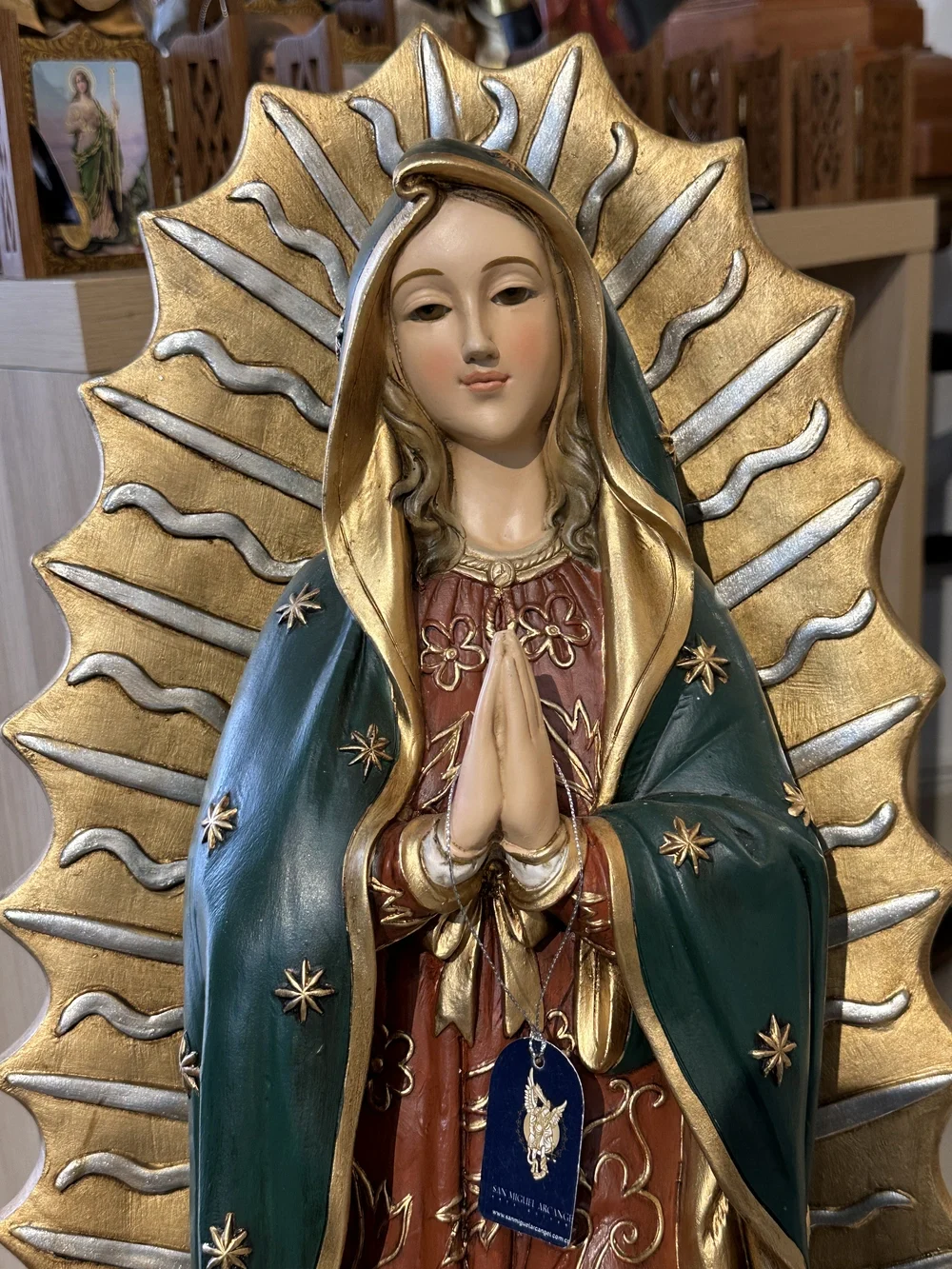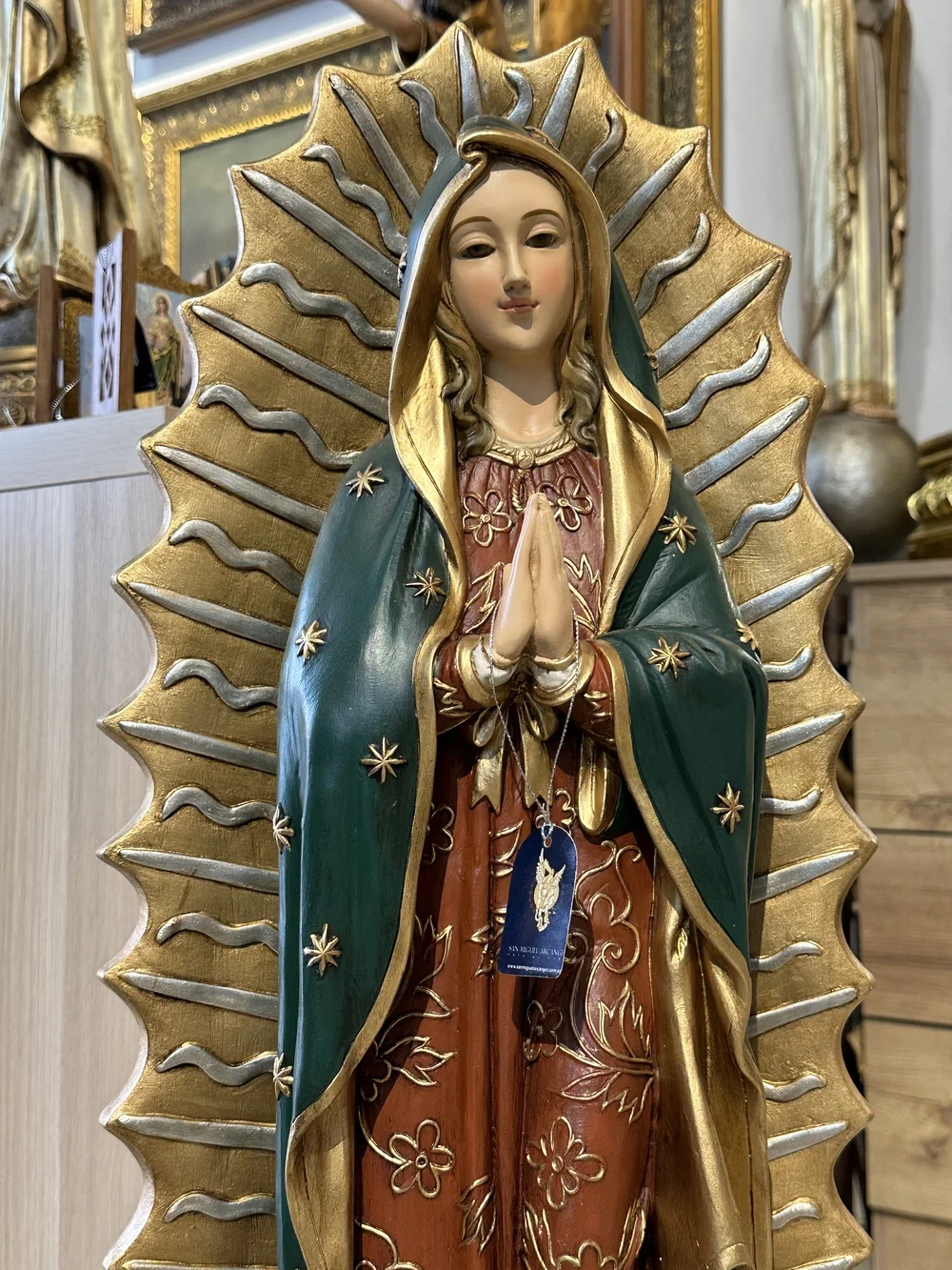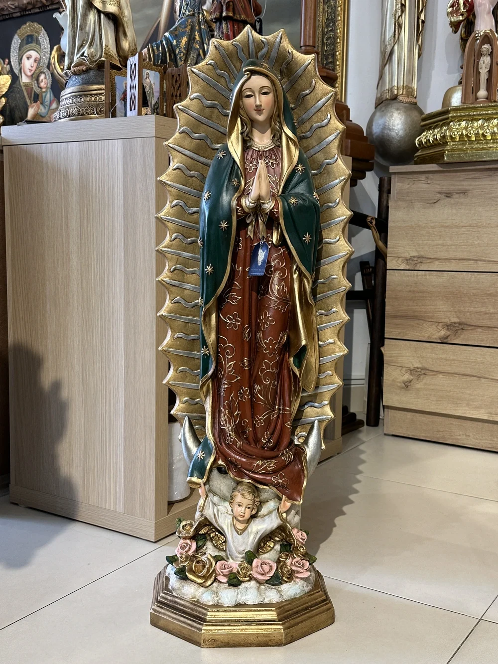Nuestra Señora de Guadalupe, cariñosamente llamada la «Morenita», es una advocación de la Virgen María con un origen milagroso que se remonta a diciembre de 1531 en el Cerro del Tepeyac, México. Su imagen, plasmada de forma sobrenatural en la tilma (manto) de San Juan Diego, un indígena recién convertido, se consolidó como el pilar de la evangelización y la identidad de todo un continente. Esta imponente imagen de 80 cm, elaborada en fibra de vidrio de alta calidad, destaca por sus delicados detalles y ligereza. El diseño se basa en la imagen original de la tilma, con un acabado en tonos ricos y simbólicos: la túnica roja, que representa la tierra y la humanidad; y el manto turquesa, que simboliza la realeza, el cielo y la unión de dos mundos. Esta paleta de colores, cargada de iconografía prehispánica, confiere a la pieza una majestuosidad profundamente arraigada en la fe y la cultura americana.