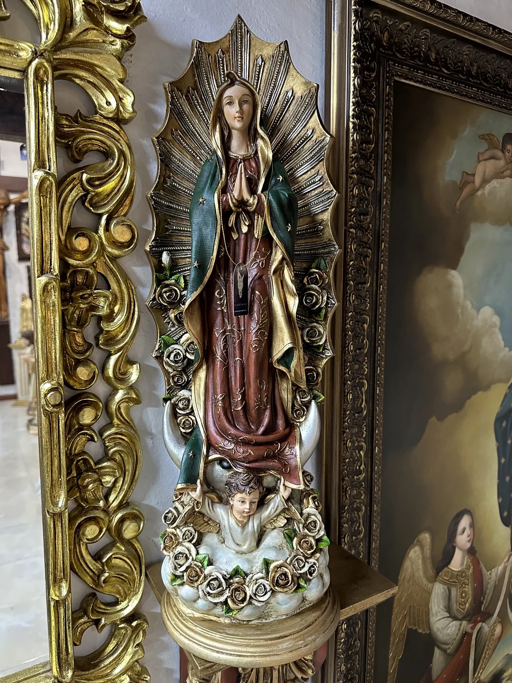 Nuestra Señora de Guadalupe, cariñosamente llamada la «Morenita», es una advocación de la Virgen María con un origen milagroso que se remonta a diciembre de 1531 en el Cerro del Tepeyac, México. Su imagen, plasmada de forma sobrenatural en la tilma (manto) de San Juan Diego, un indígena recién convertido, se consolidó como el pilar de la evangelización y la identidad de todo un continente. Esta imponente imagen es elaborada en fibra de vidrio de alta calidad, destaca por sus delicados detalles y ligereza. El diseño se basa en la imagen original de la tilma, con un acabado en tonos ricos y simbólicos: la túnica roja, que representa la tierra y la humanidad; y el manto turquesa, que simboliza la realeza, el cielo y la unión de dos mundos. Esta paleta de colores, cargada de iconografía prehispánica, confiere a la pieza una majestuosidad profundamente arraigada en la fe y la cultura americana.
