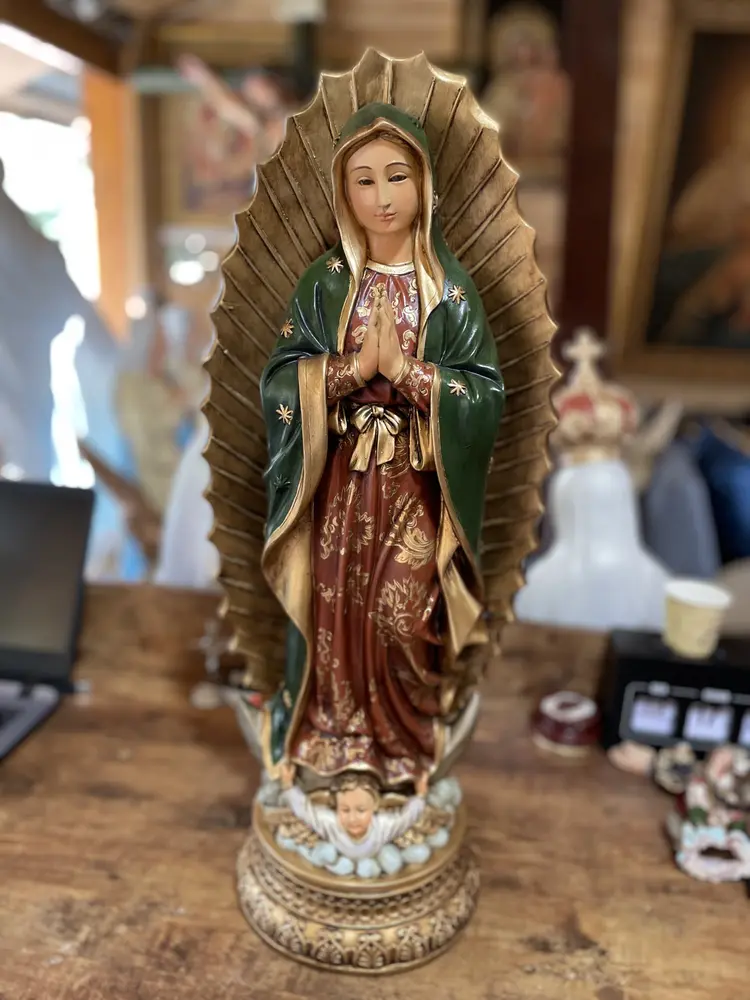 Esta pieza es una obra de arte que evoca la maternidad, la protección incondicional y el encuentro cultural a través de la fe. Perfecta para presidir el altar mayor o lateral de iglesias, capillas y centros espirituales. Gracias a la fibra de vidrio de alta calidad, la imagen es inherentemente resistente y apta para cualquier ubicación, ya sea en salones y altares familiares, o en exteriores como atrios, jardines y grutas.