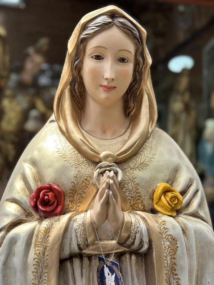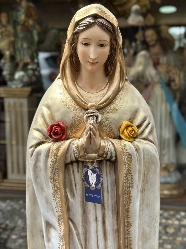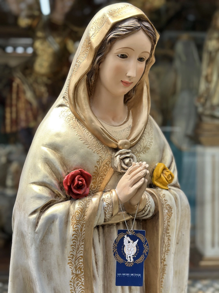 Nuestra Señora de la Rosa Mística es una advocación mariana ligada a una serie de apariciones reportadas por la vidente Pierina Gilli en Montichiari, Italia, a partir de 1947. La Virgen se presenta como un llamado urgente a la Oración, Penitencia y Reparación, dirigido especialmente a las almas consagradas y a toda la Iglesia en tiempos de crisis. Esta imagen, de 120 cm y elaborada en fibra de vidrio, transmite la pureza y la gracia celestial de María. El mensaje central de esta advocación se resume en las tres rosas que adornan su pecho que simboliza el ofrecimiento de las virtudes para sanar las heridas del Cuerpo Místico de Cristo.