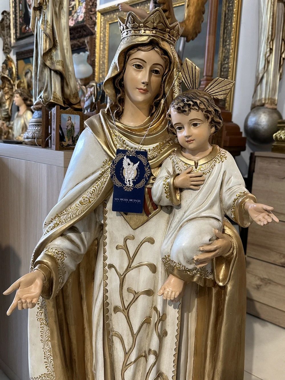 Nuestra Señora de las Mercedes, conocida cariñosamente como la Virgen de la Merced, es la Redentora y Patrona de los Cautivos. Esta imponente imagen de 100 cm, elaborada en fibra de vidrio de alta calidad, destaca por sus delicados detalles y ligereza. El diseño presenta un acabado con tonos tradicionales y profundos, fiel a la iconografía Mercedaria: la túnica y el manto blancos que simbolizan la pureza y el voto de castidad, y el Escudo de la Orden sobre el pecho. Esta paleta de colores confiere a la pieza una majestuosidad atemporal y solemne, haciendo de ella un tesoro de fe y protección.