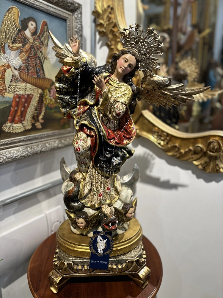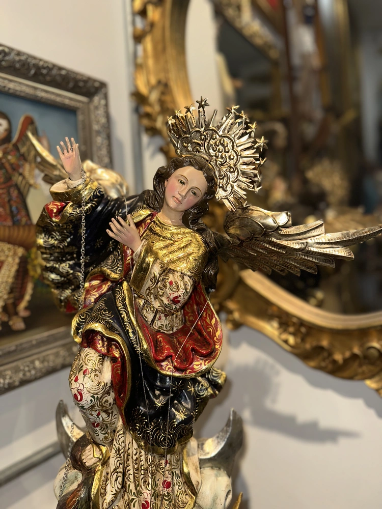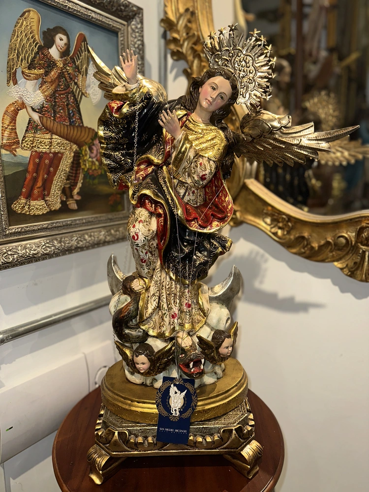 Esta exquisita imagen de 60 cm de alto es una auténtica representación del arte barroco colonial americano, siendo una talla en madera fiel a la tradición de la Escuela Quiteña (siglos XVII-XVIII). Esta pieza es una Obra de Arte Única, fruto de un meticuloso y dedicado trabajo artístico manual. Cada curva de la talla, cada pincelada de color y cada detalle ha sido ejecutado por artesanos calificados que preservan las técnicas ancestrales de la Escuela Quiteña. El resultado es una escultura con un alma propia, donde la impronta de la mano del artista garantiza su exclusividad.