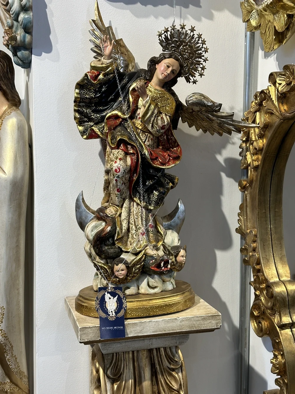 Esta representación exalta a María como la Inmaculada Concepción y la Reina de América. Ella se halla de pie sobre la media luna y el dragón (símbolo del pecado o el demonio), en una pose de triunfo. El dinamismo de la figura y sus alas la proclaman como la patrona y protectora de la ciudad de Quito.