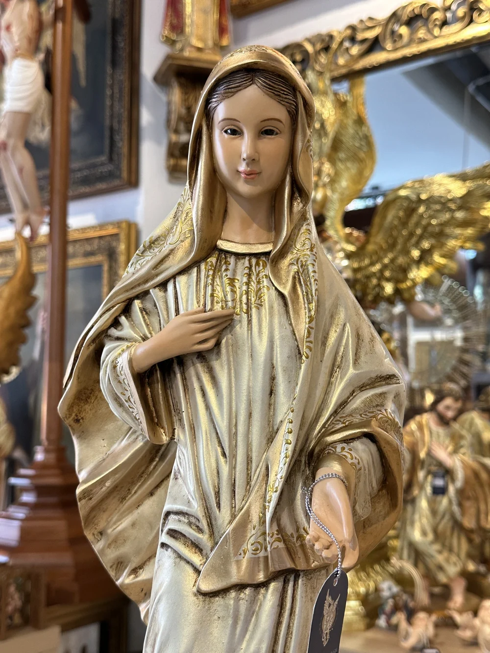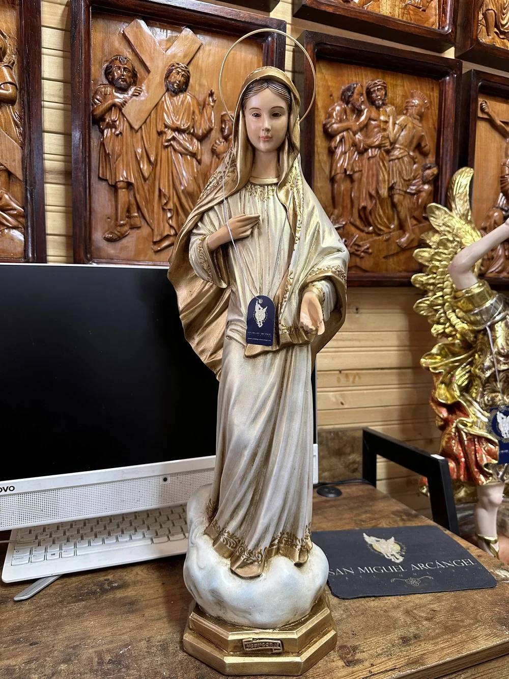 La Virgen Reina de la Paz de Medjugorje, mensajera de la paz y la reconciliación en la historia reciente de la Iglesia. Esta sobria y hermosa pieza de 60 cm de altura, elaborada en fibra de vidrio de alta resistencia, destaca por su diseño que refleja la sencillez y la dignidad de la figura de la Virgen tal como se describe en los relatos de los videntes. Con colores claros y sencillos y un acabado envejecido, la imagen irradia una profunda fe y espiritualidad, invitando a la oración y la meditación sobre su trascendente llamado a la paz mundial.