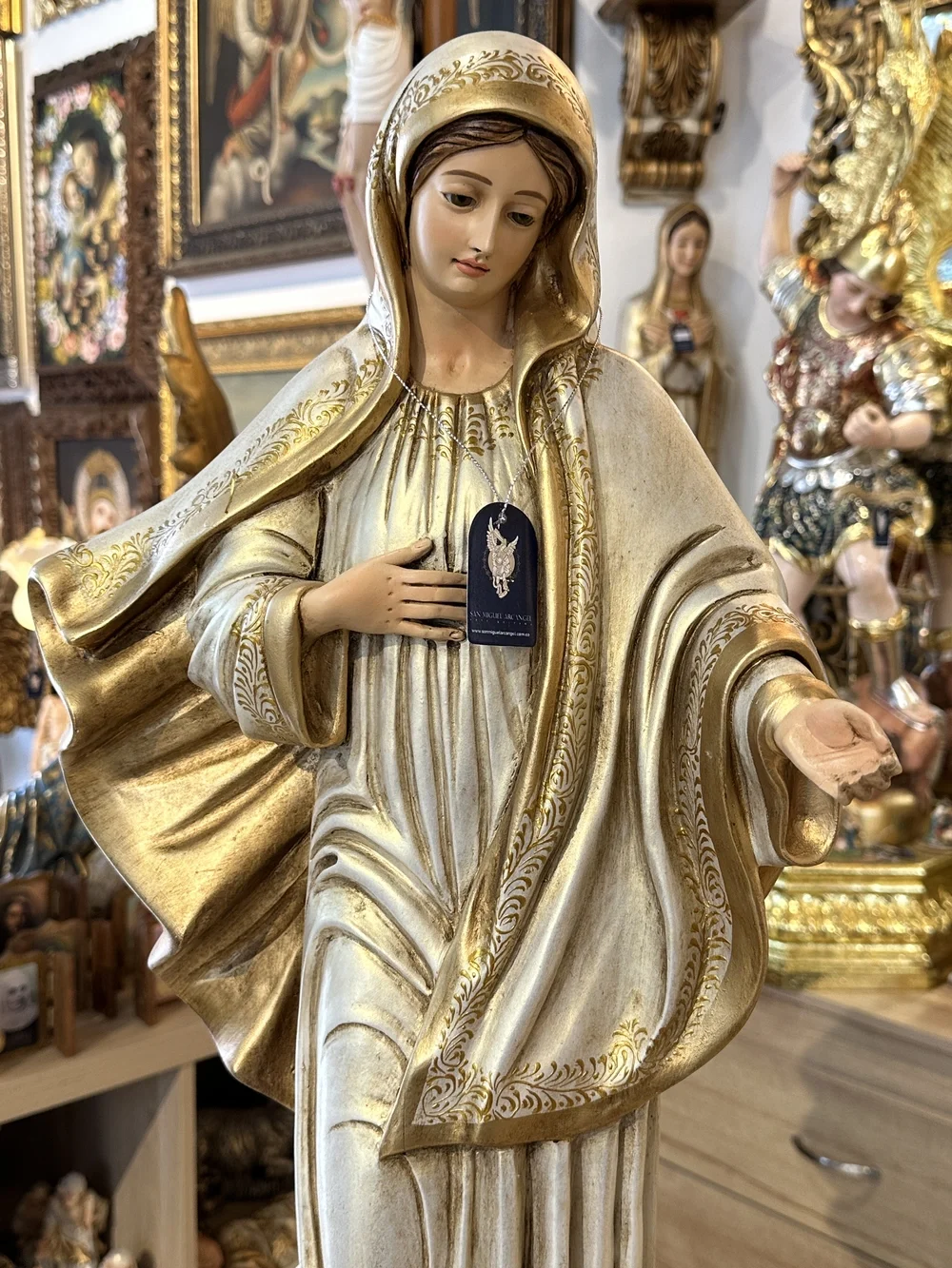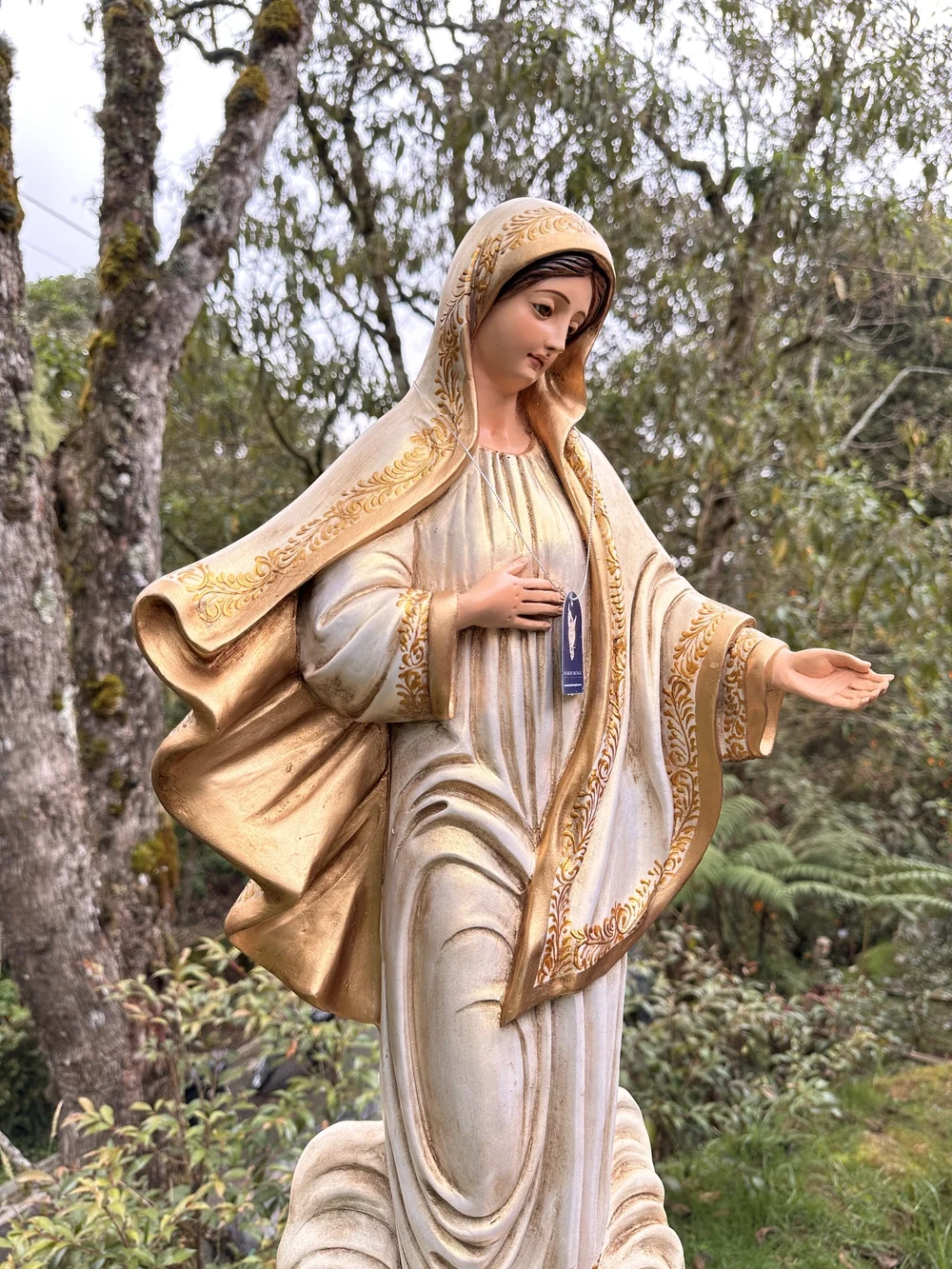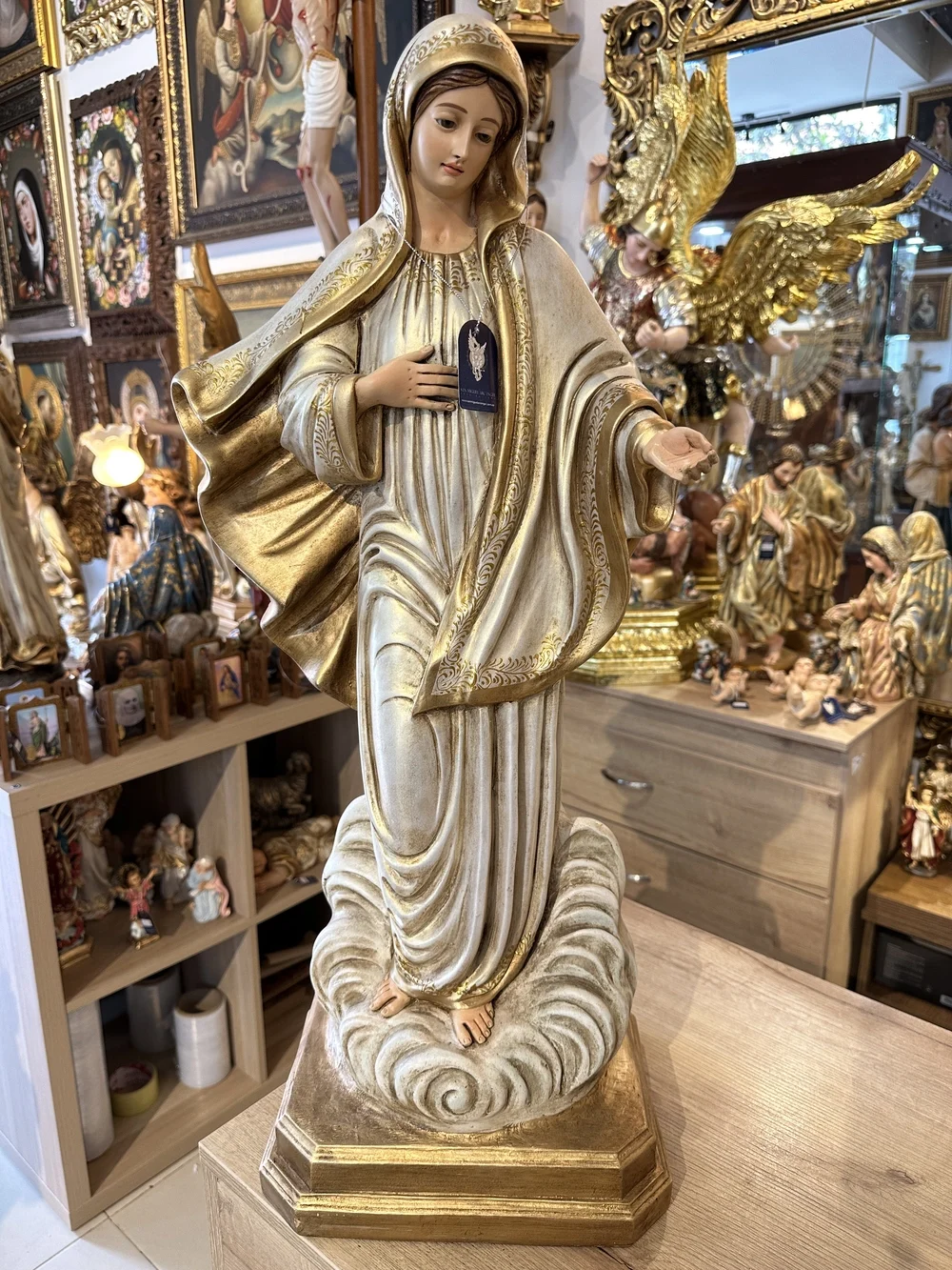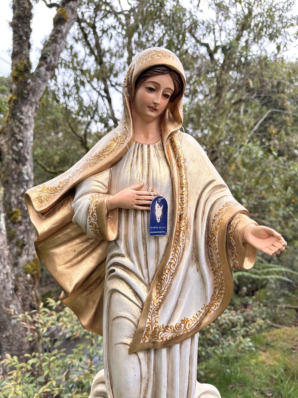 La Virgen Reina de la Paz de Medjugorje, mensajera de la paz y la reconciliación en la historia reciente de la Iglesia. Esta sobria y hermosa pieza de 75 cm de altura, elaborada en fibra de vidrio de alta resistencia, destaca por su diseño que refleja la sencillez y la dignidad de la figura de la Virgen tal como se describe en los relatos de los videntes. Con colores claros y sencillos y un acabado envejecido, la imagen irradia una profunda fe y espiritualidad, invitando a la oración y la meditación sobre su trascendente llamado a la paz mundial.