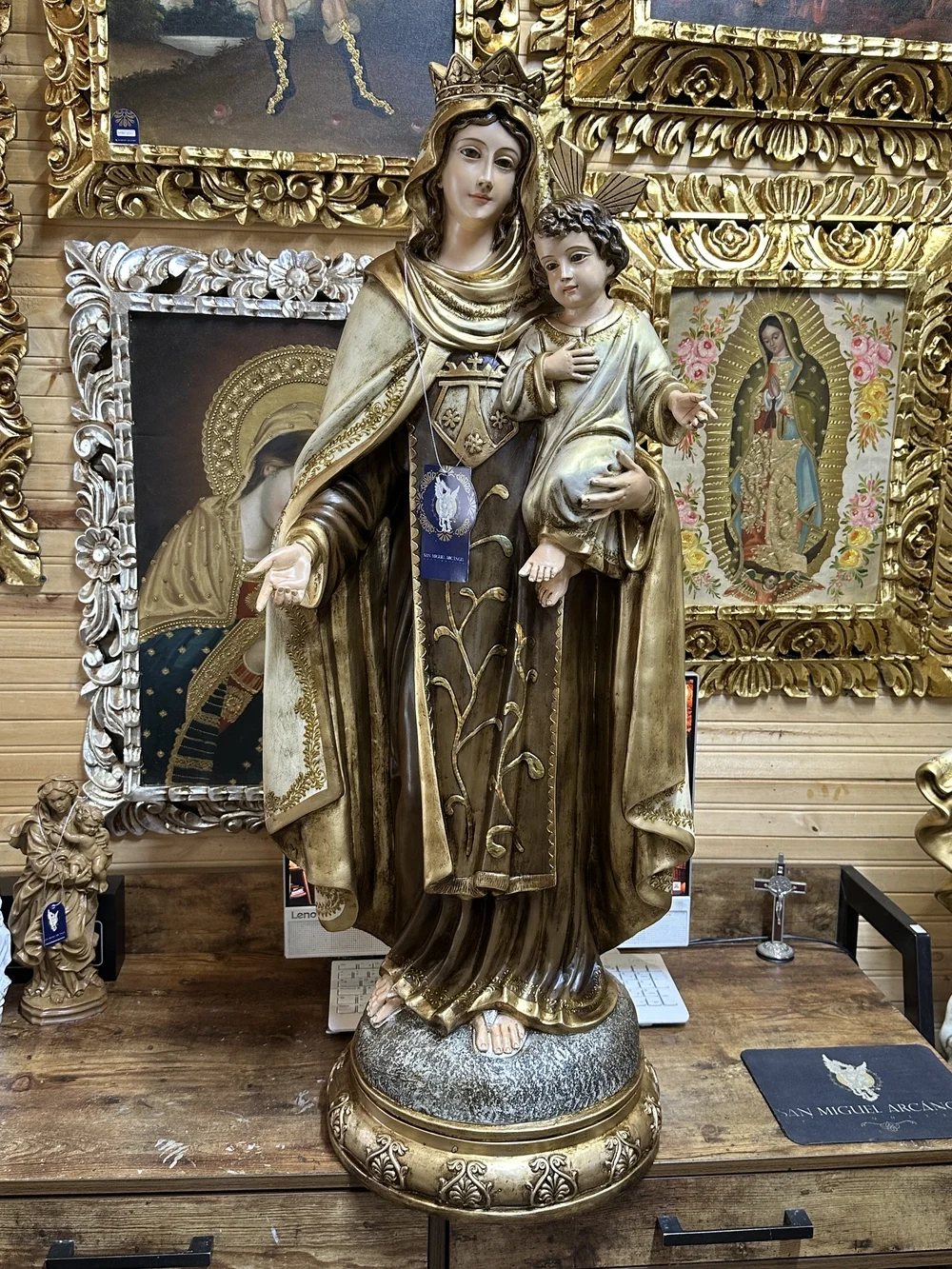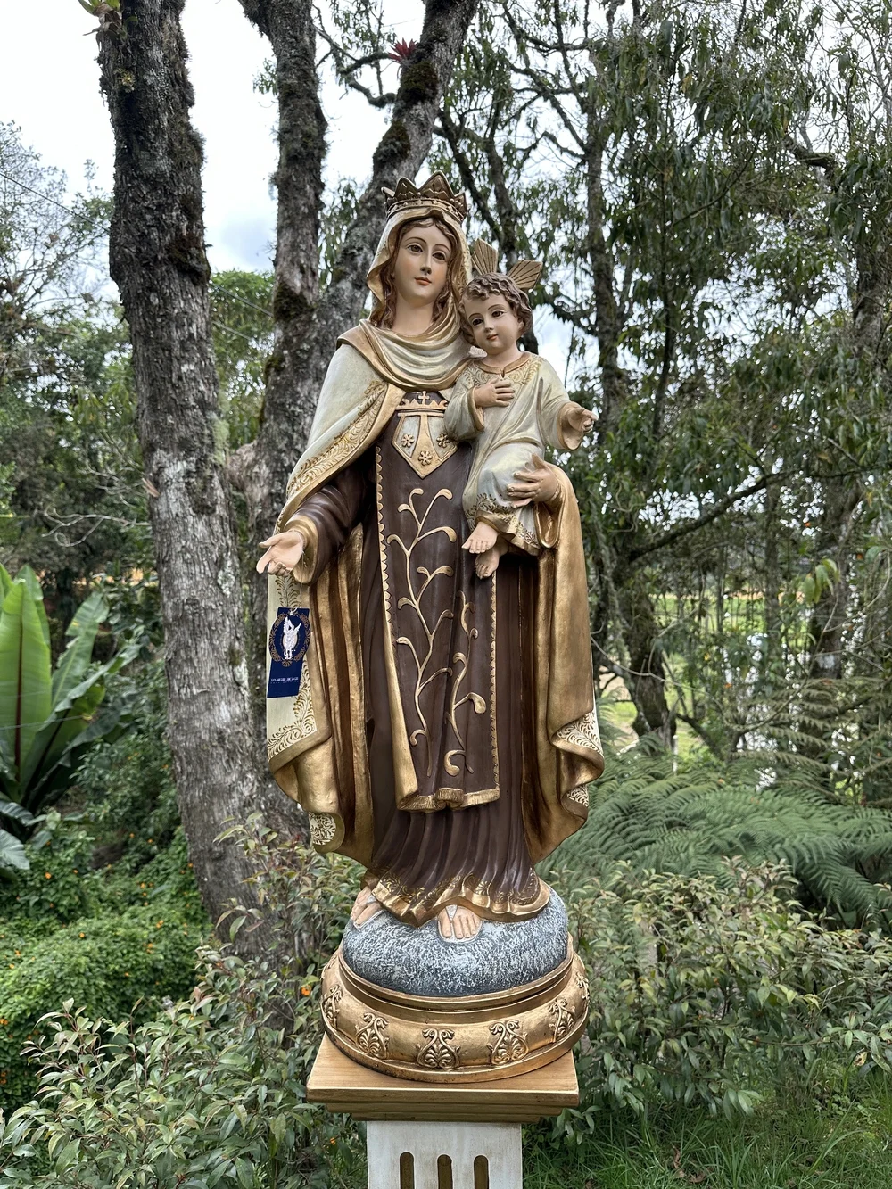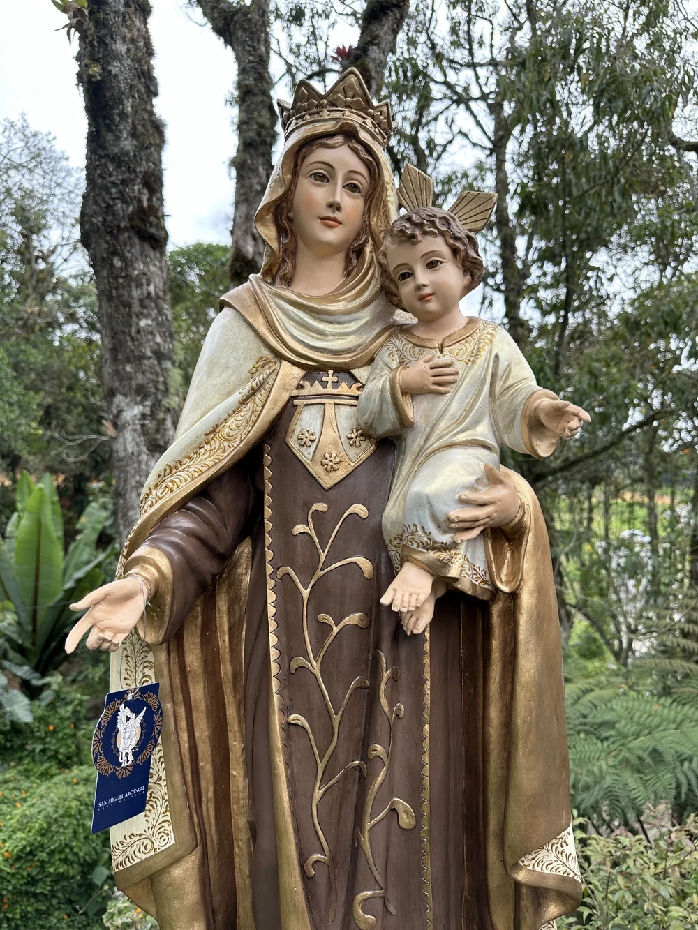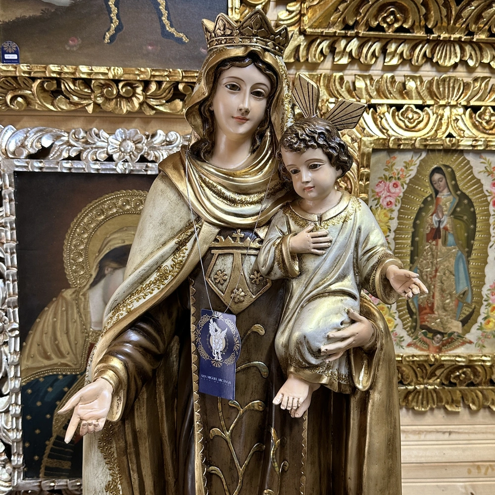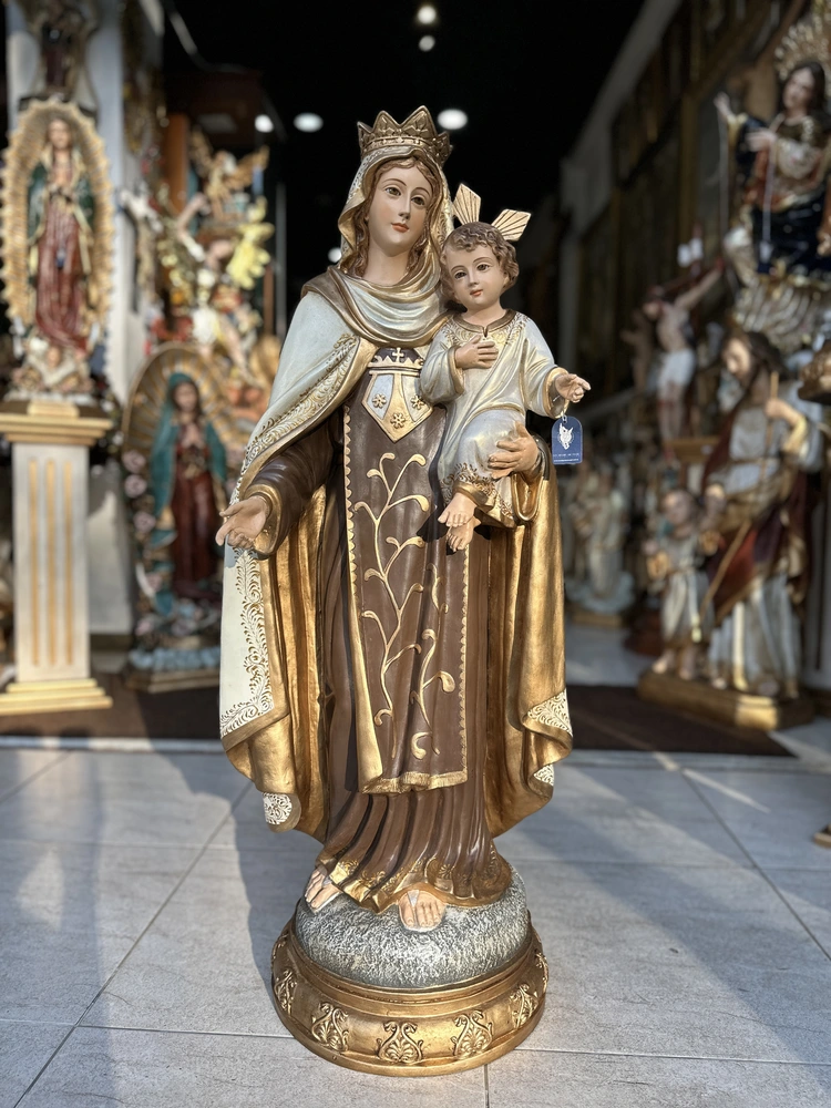 Nuestra Señora del Monte Carmelo, conocida cariñosamente como la Virgen del Carmen, es la Reina y Señora del Monte Carmelo. Esta imponente imagen de 100 cm, elaborada en fibra de vidrio de alta calidad, destaca por sus delicados detalles y ligereza. El diseño presenta un acabado con tonos tradicionales y profundos, fiel a la iconografía Carmelita: la túnica café que simboliza la humildad y el hábito de la Orden, y el manto blanco que representa la pureza celestial y la fidelidad. Esta paleta de colores confiere a la pieza una majestuosidad atemporal y solemne, haciendo de ella un tesoro de fe y protección.