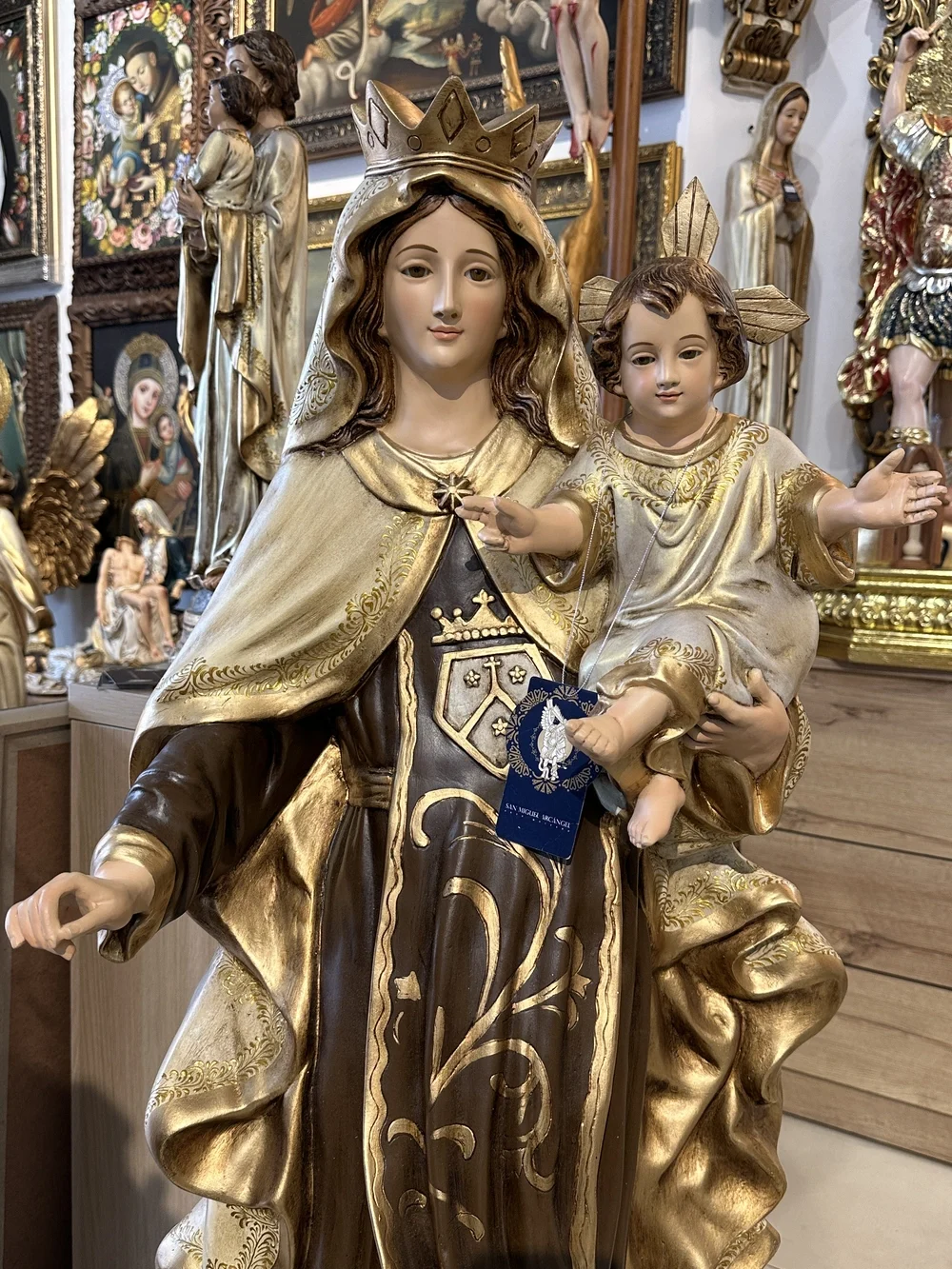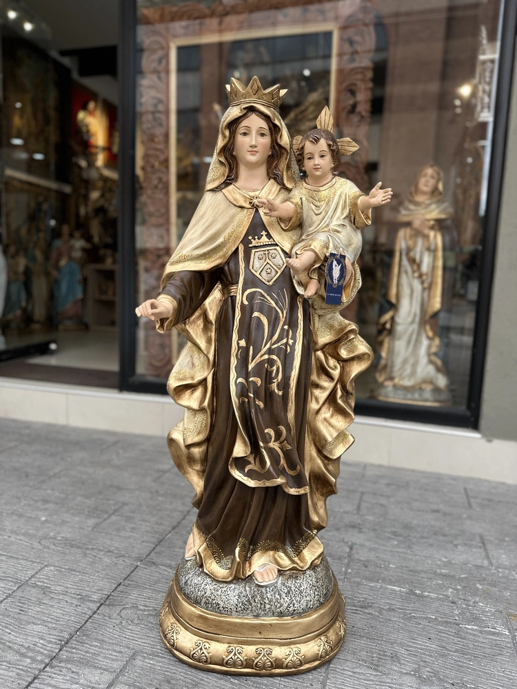 Nuestra Señora del Monte Carmelo, conocida cariñosamente como la Virgen del Carmen, es la Reina y Señora del Monte Carmelo. Esta imponente imagen de 120 cm, elaborada en fibra de vidrio de alta calidad, destaca por sus delicados detalles y ligereza. El diseño presenta un acabado con tonos tradicionales y profundos, fiel a la iconografía Carmelita: la túnica café que simboliza la humildad y el hábito de la Orden, y el manto blanco que representa la pureza celestial y la fidelidad. Esta paleta de colores confiere a la pieza una majestuosidad atemporal y solemne, haciendo de ella un tesoro de fe y protección.