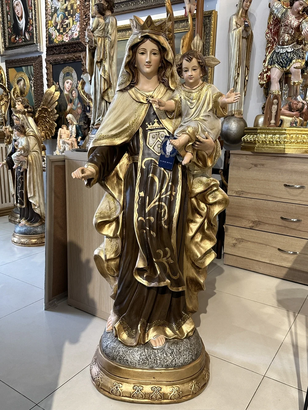 Esta pieza es una obra de arte que evoca la protección incondicional y la fuerza intercesora de la Madre de Dios. Perfecta para presidir el altar mayor o lateral de iglesias, capillas y centros espirituales. Gracias a la fibra de vidrio de alta calidad, la imagen es inherentemente resistente y apta para cualquier ubicación, ya sea en salones y altares familiares, o en exteriores como atrios, jardines y grutas.
