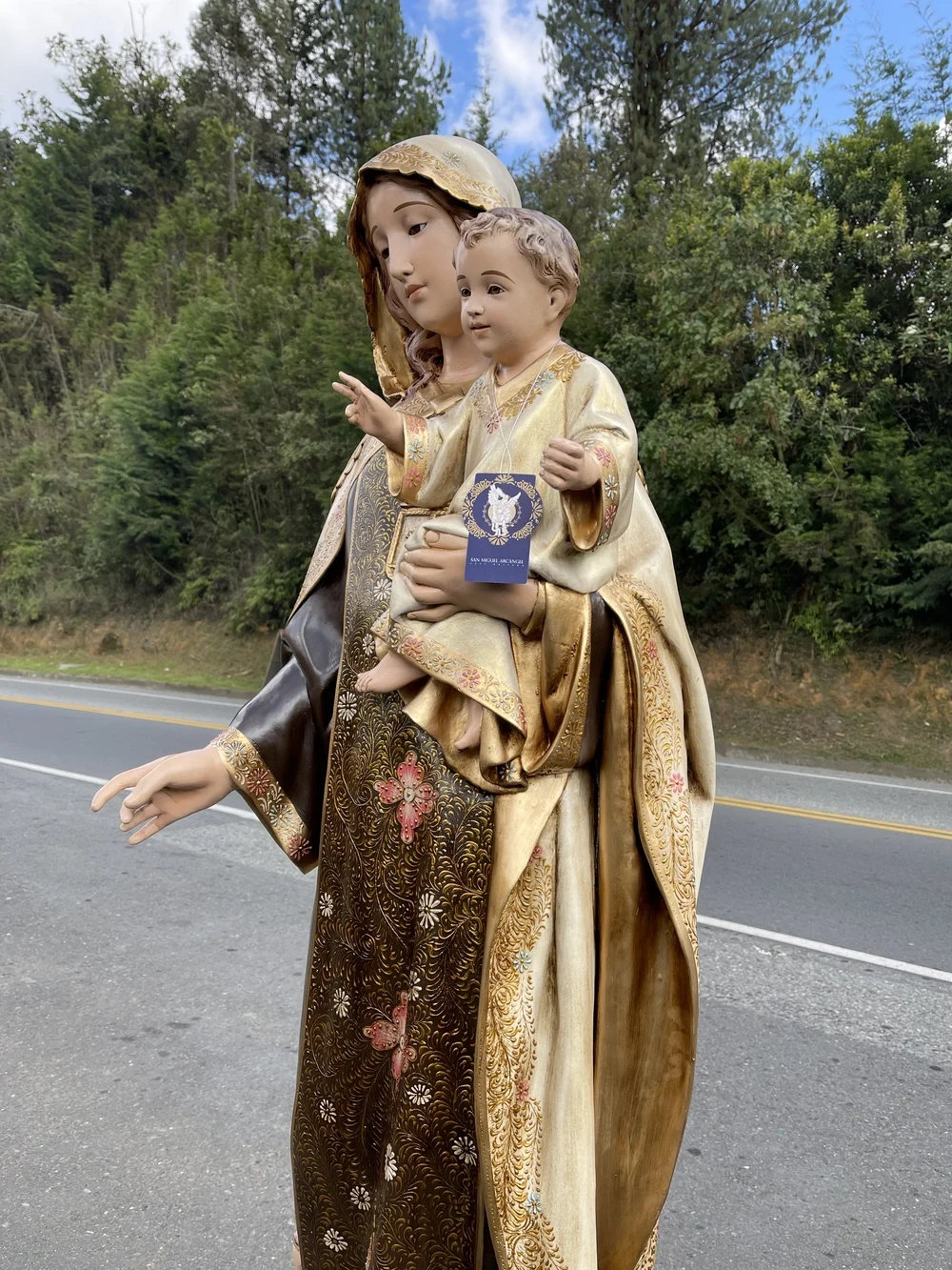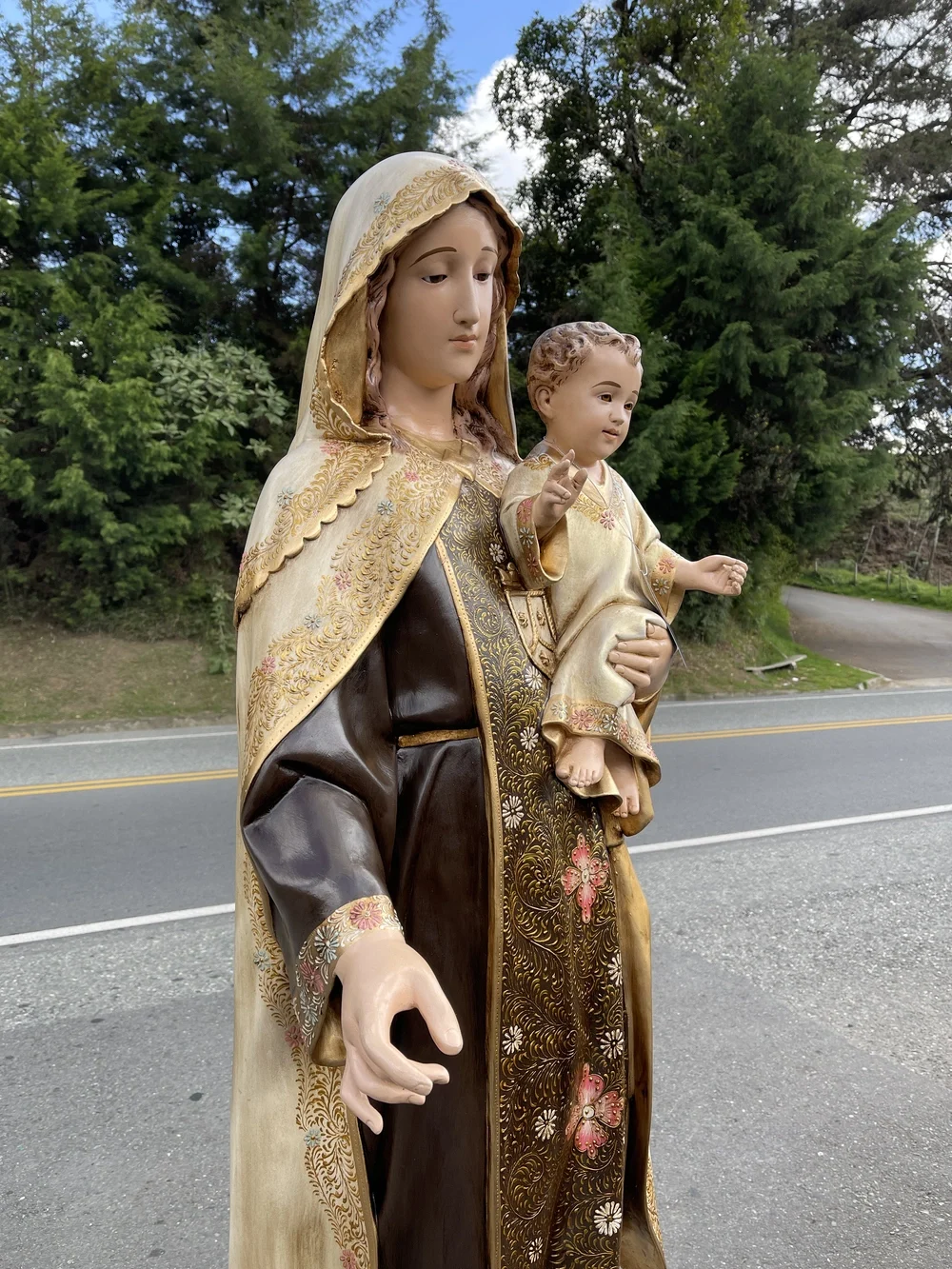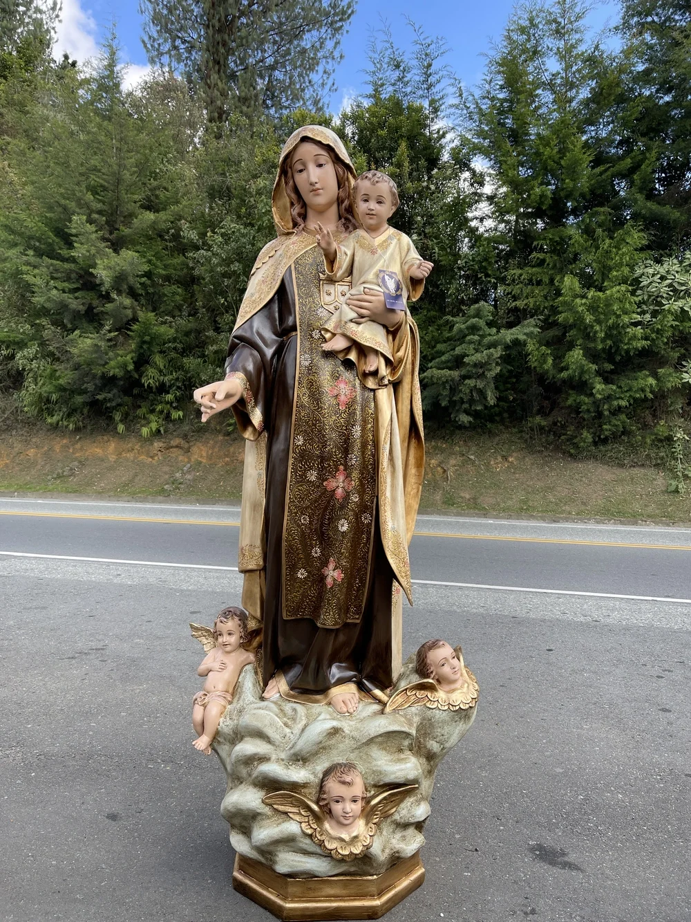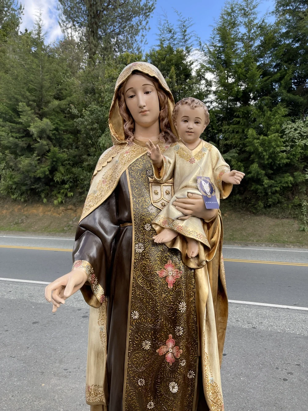 Nuestra Señora del Monte Carmelo, conocida cariñosamente como la Virgen del Carmen, es la Reina y Señora del Monte Carmelo. Esta imponente imagen de 180 cm, elaborada en fibra de vidrio de alta calidad, destaca por sus delicados detalles y ligereza. El diseño presenta un acabado con tonos tradicionales y profundos, fiel a la iconografía Carmelita: la túnica café que simboliza la humildad y el hábito de la Orden, y el manto blanco que representa la pureza celestial y la fidelidad. Esta paleta de colores confiere a la pieza una majestuosidad atemporal y solemne, haciendo de ella un tesoro de fe y protección.