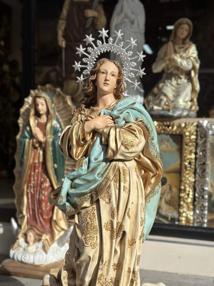 La Virgen Inmaculada Concepción, Patrona de España y faro de la pureza de la fe. Esta magnífica imagen de 110 cm de altura, elaborada en fibra de vidrio de alta calidad, destaca por su diseño que combina ligereza con una gran riqueza de detalles. Cuidadosamente pintada con colores tradicionales —el manto azul celeste y la túnica blanca— y enriquecida con un acabado envejecido que le confiere una pátina de solemnidad y atemporalidad, haciéndola un verdadero punto de encuentro entre el arte y la fe.