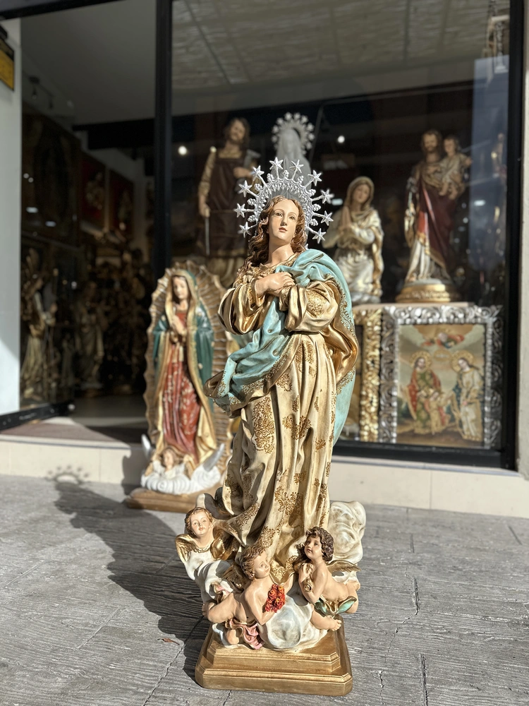 La Inmaculada Concepción representa la verdad de fe de que María fue preservada de todo pecado original desde el momento mismo de su concepción. Mostrada de pie sobre un Creciente Lunar, un símbolo asociado a la mujer del Apocalipsis y a la luz de Cristo que ilumina la noche del pecado. La presencia de querubines entre nubes a sus pies refuerza esta visión celestial, ya que los ángeles y serafines están al servicio de la Madre de Dios, elevándola y sirviendo como mensajeros y custodios de su pureza y gloria. Sus Manos están usualmente unidas en oración, reflejando su papel de intercesora.