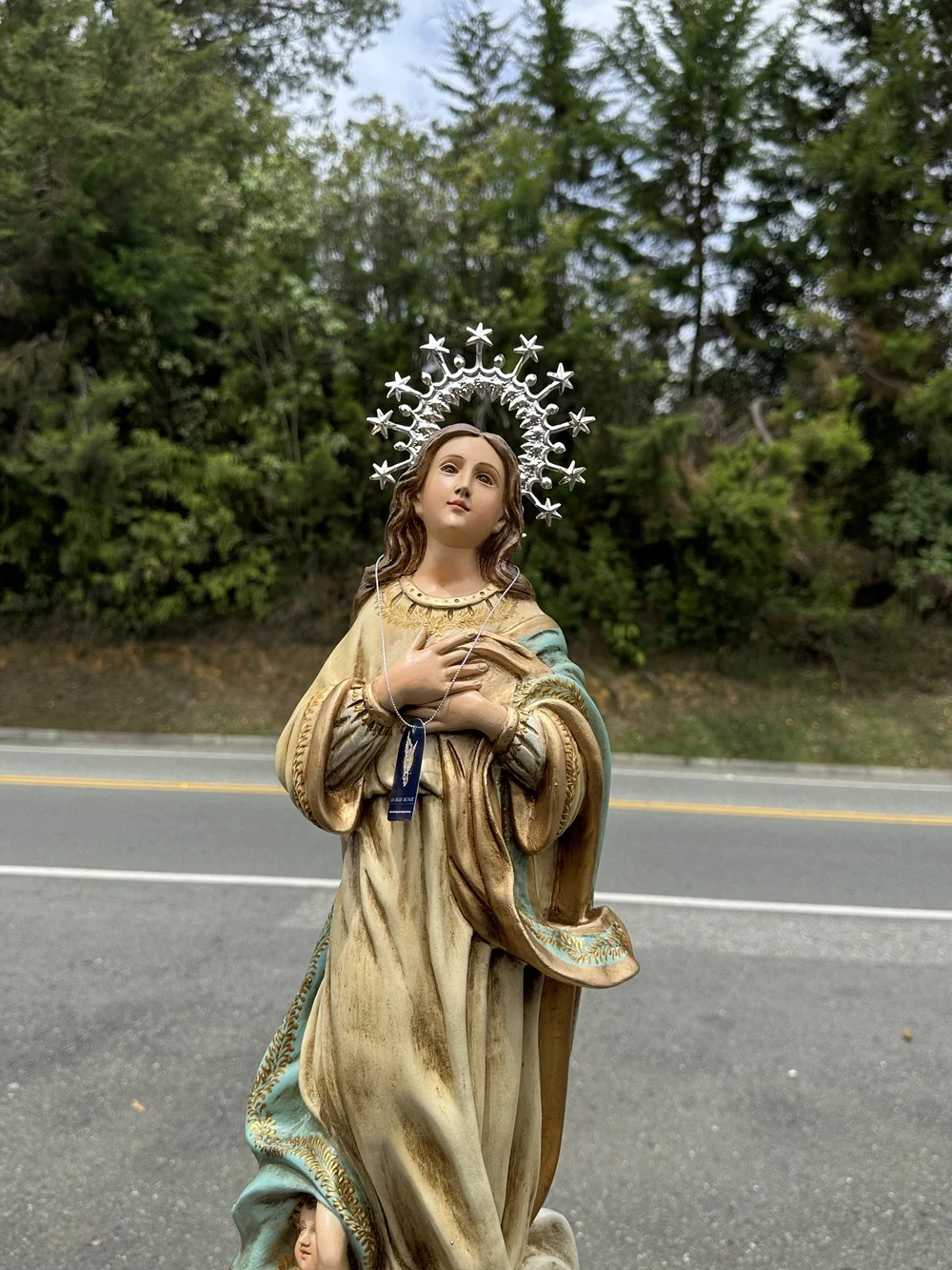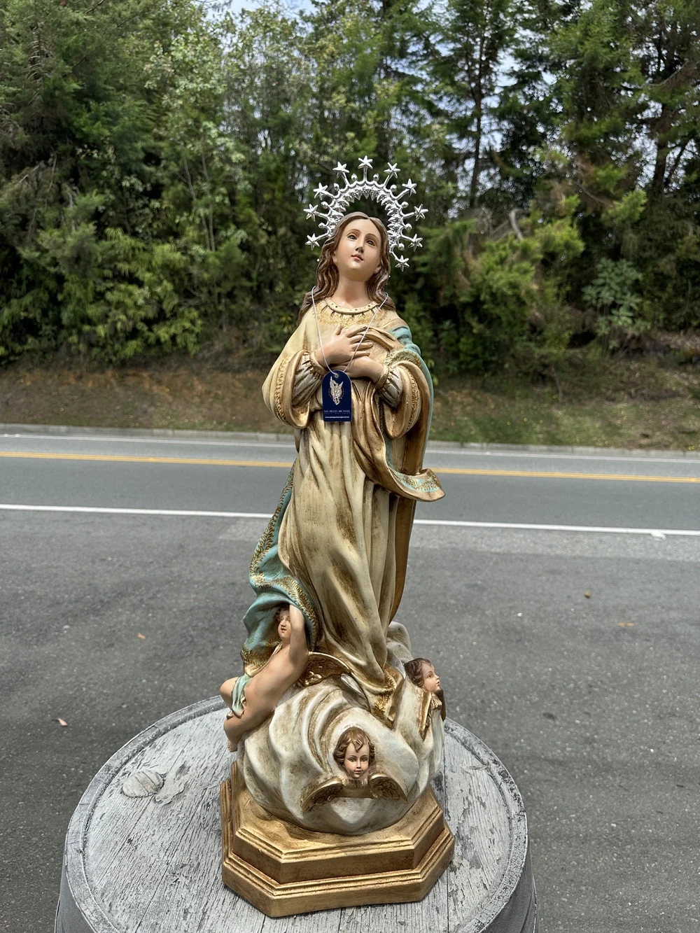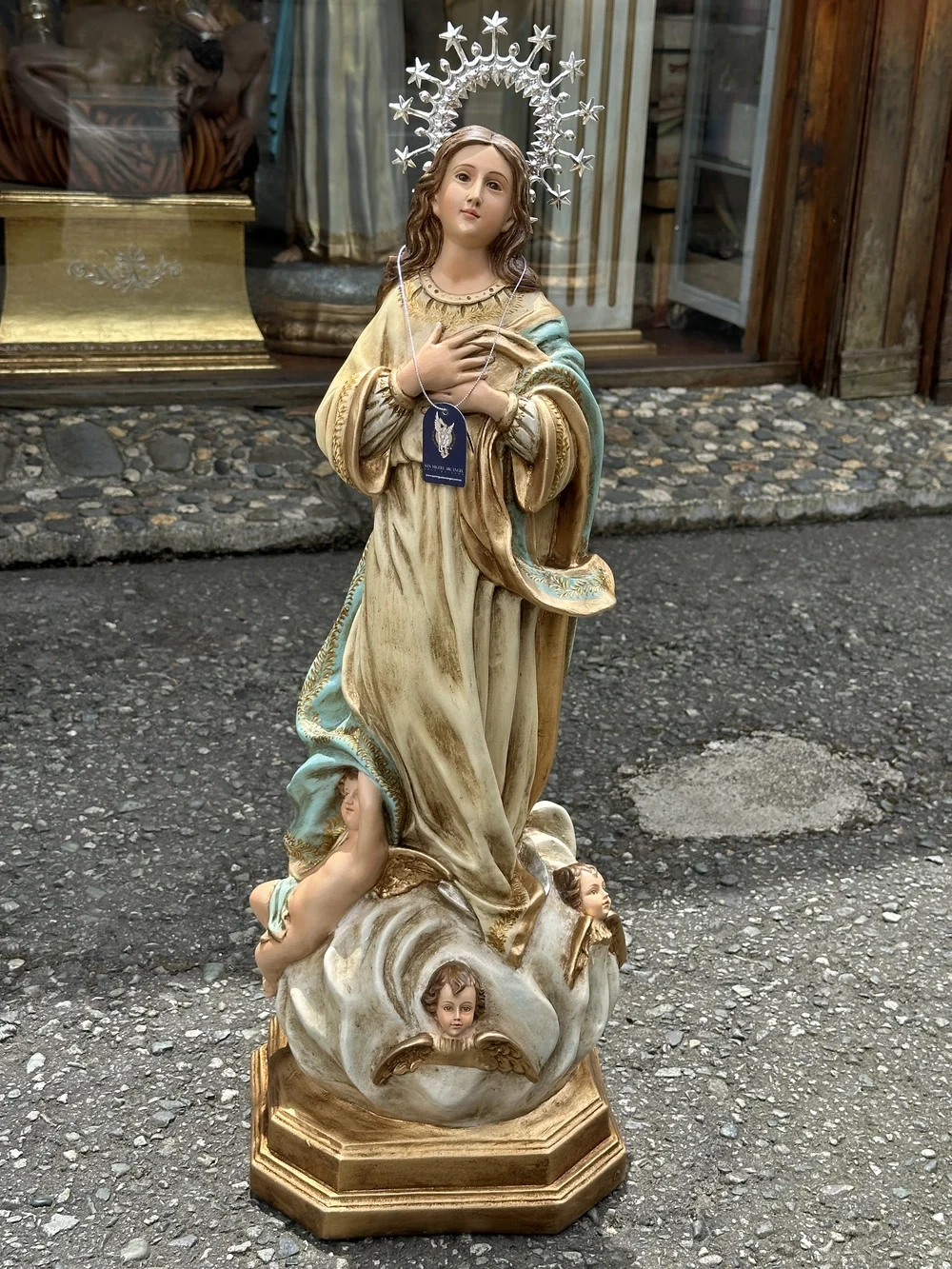 La Inmaculada Concepción representa la verdad de fe de que María fue preservada de todo pecado original desde el momento mismo de su concepción. Mostrada de pie sobre un Creciente Lunar, un símbolo asociado a la mujer del Apocalipsis y a la luz de Cristo que ilumina la noche del pecado. La presencia de querubines entre nubes a sus pies refuerza esta visión celestial, ya que los ángeles y serafines están al servicio de la Madre de Dios, elevándola y sirviendo como mensajeros y custodios de su pureza y gloria. Sus Manos están usualmente unidas en oración, reflejando su papel de intercesora.