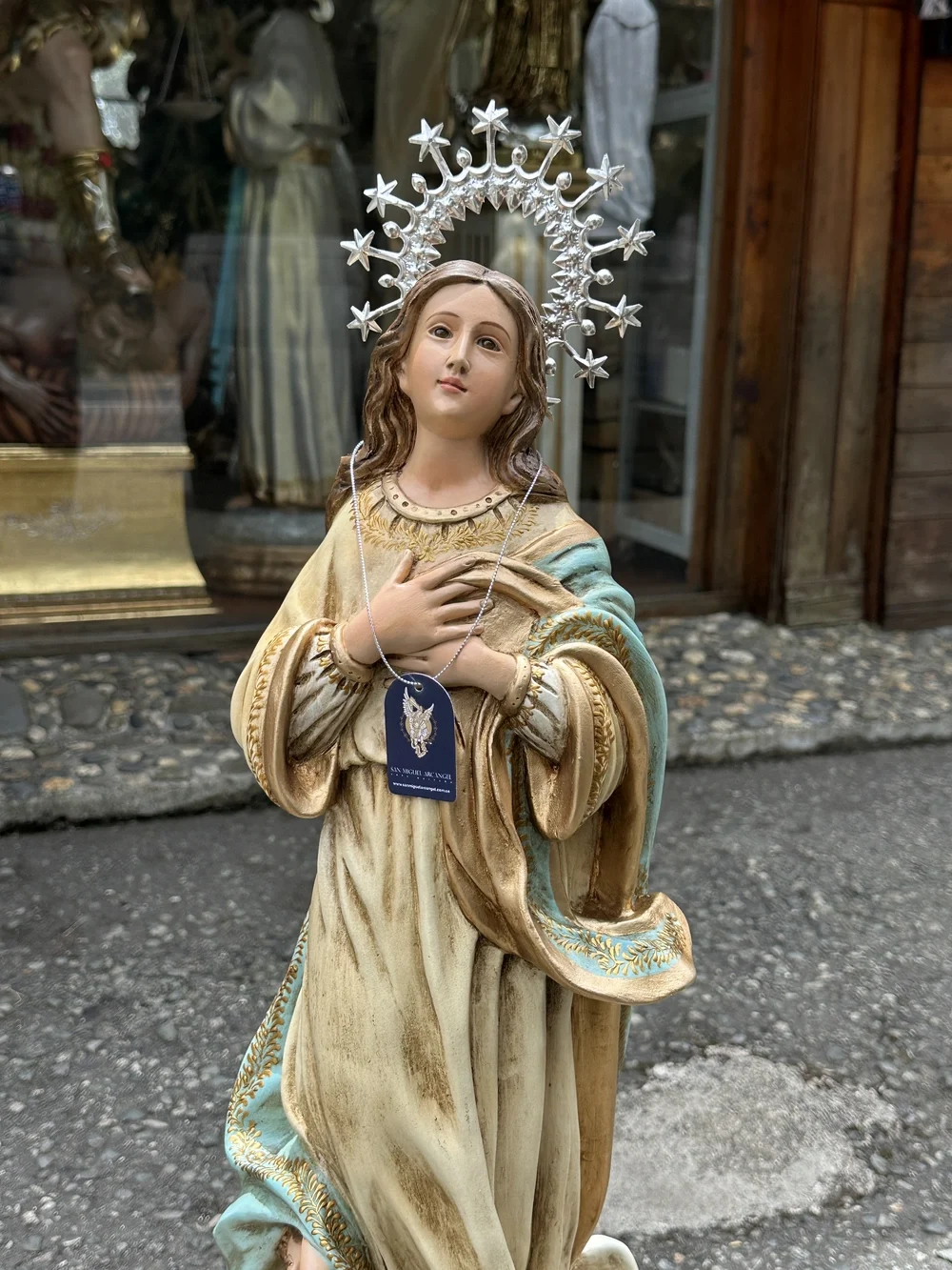 La Virgen Inmaculada Concepción, Patrona de España y faro de la pureza de la fe. Esta magnífica imagen de 70 cm de altura, elaborada en fibra de vidrio de alta calidad, destaca por su diseño que combina ligereza con una gran riqueza de detalles. Cuidadosamente pintada con colores tradicionales —el manto azul celeste y la túnica blanca— y enriquecida con un acabado envejecido que le confiere una pátina de solemnidad y atemporalidad, haciéndola un verdadero punto de encuentro entre el arte y la fe.